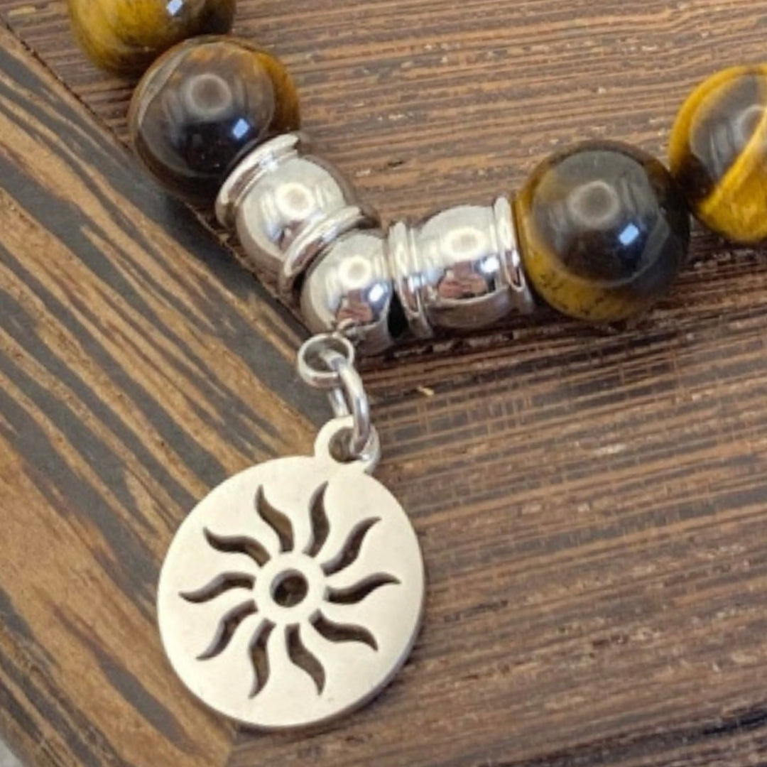 High-quality 8mm Tiger's Eye stretch bracelet with stainless steel sun charm. Available in both standard sizing and relaxed-fit. Comes with a velvet pouch for easy gift-giving.