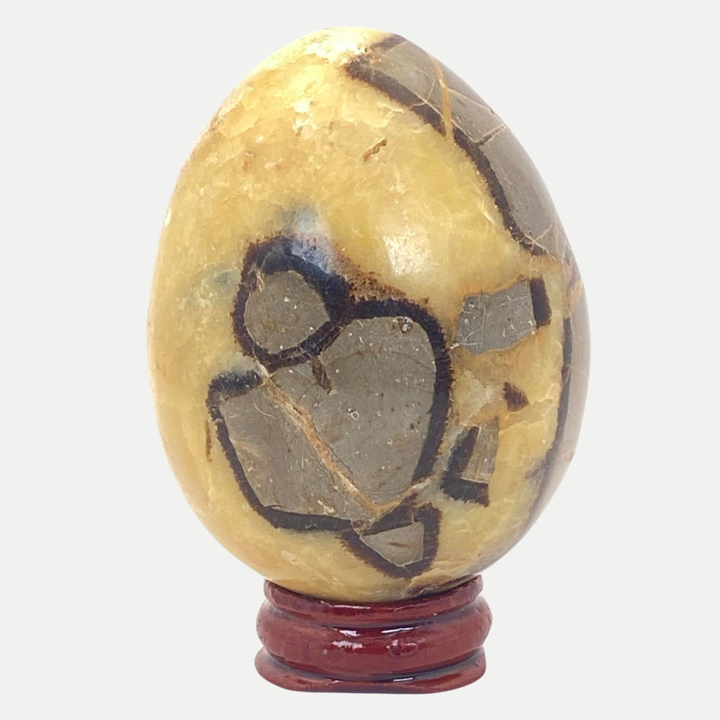 The name Septarian comes from the Latin word 'septem', meaning 'seven', since it seems to form in patterns of seven. The yellow-coloured material is Calcite, the brown is Aragonite, and the outer grey is Limestone. Some specimens may also include white or clear Barite as well. It's often called Septarian Agate or Septarian Jasper, however, it is neither. Both Agate and Jasper are minerals, whereas Septarian is a rock. Formed through volcanic eruptions, its spherical shape and smooth dragon-skin appearance is what earned them the name of Septarian Dragon Eggs. According to Ancient Malagasy (Madagascar native) legend, when dragons ceased to exist millions of years ago, their remains fossilised and formed Septarian. People would use it as a talisman for courage and grounding, believing it drew its powers from deep inside Mother Earth. It is a stone of healing (both physically and metaphysically) and protection.