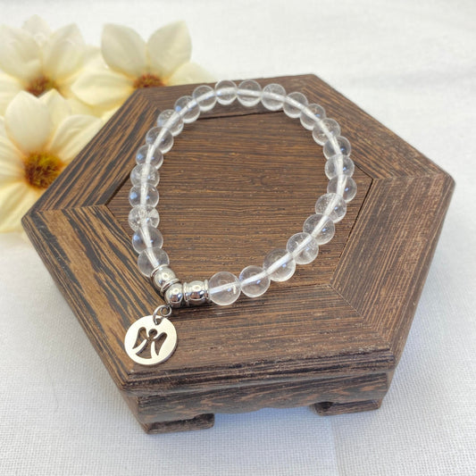 8mm Clear Quartz Angel Charm Stretch Bracelet - Standard & Relaxed-Fit!