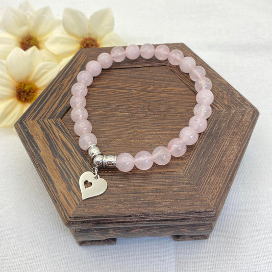 8mm Brazillian Rose Quartz Heart Charm Stretch Bracelet - Standard & Relaxed-Fit!
