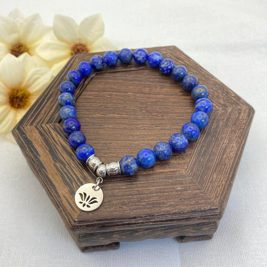8mm Lapis Lazuli Lotus Charm Stretch Bracelet - Standard & Relaxed-Fit!