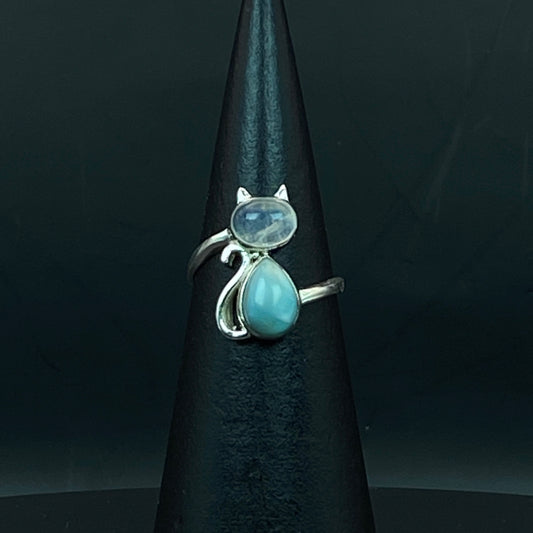 .925 Sterling Silver Rainbow Moonstone & Larimar Cat Ring - Size 9