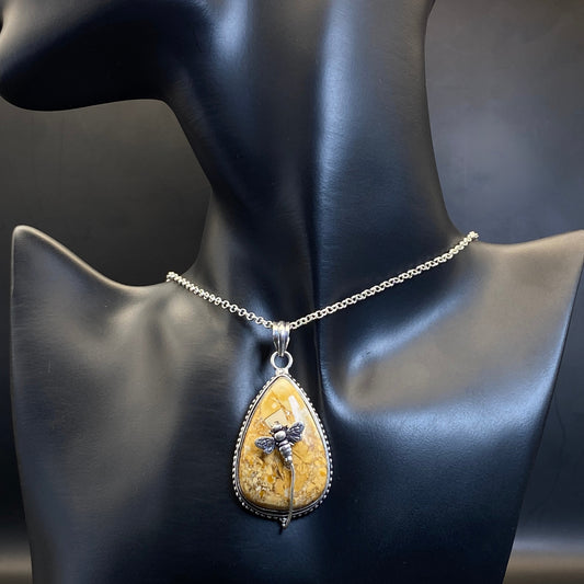 .925 Sterling Silver Brecciated Mookaite Jasper Teardrop Bee Pendant