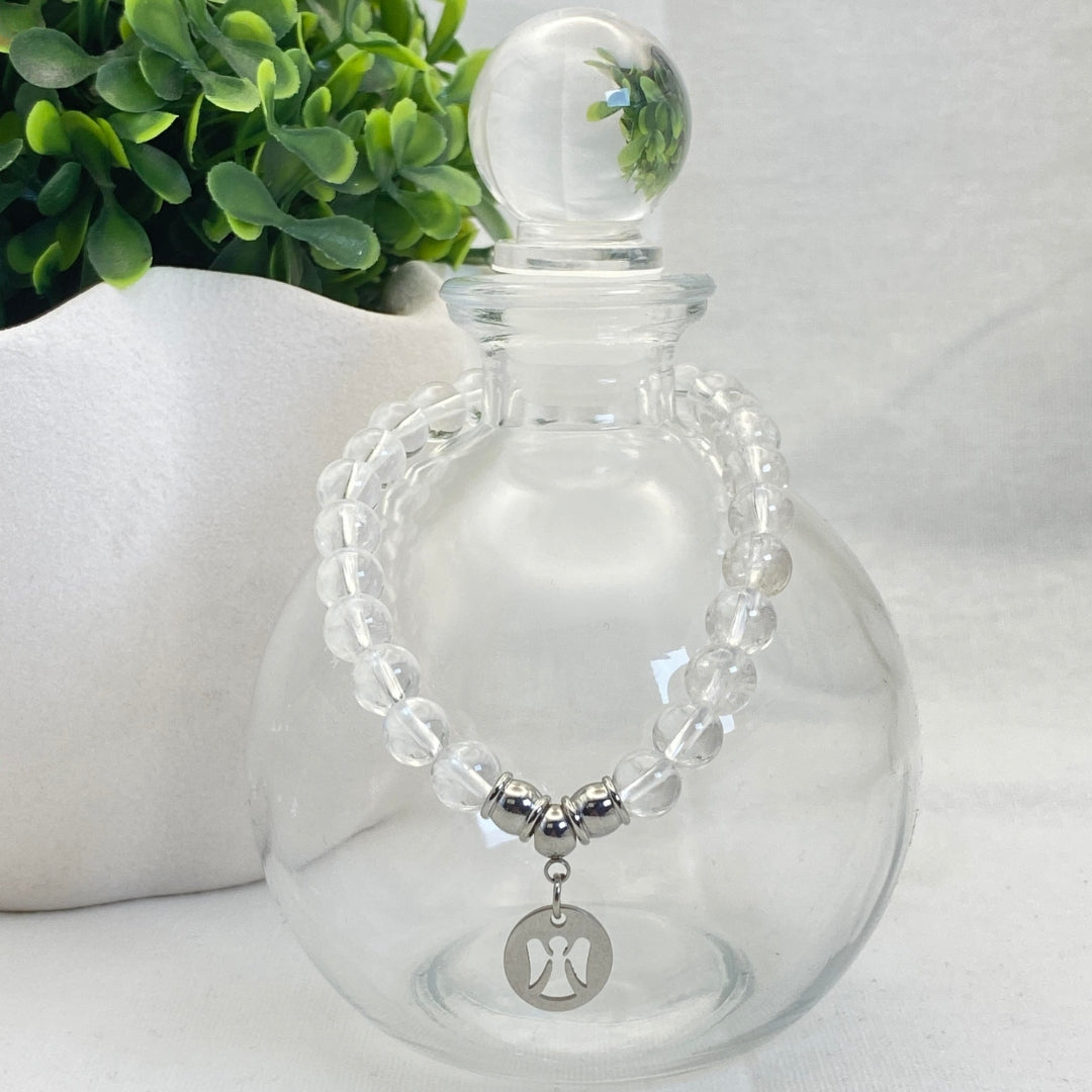 8mm Clear Quartz stretch bracelet with stainless steel angel charm. Available in both standard sizing and relaxed-fit. Comes with a velvet pouch for easy gift-giving.