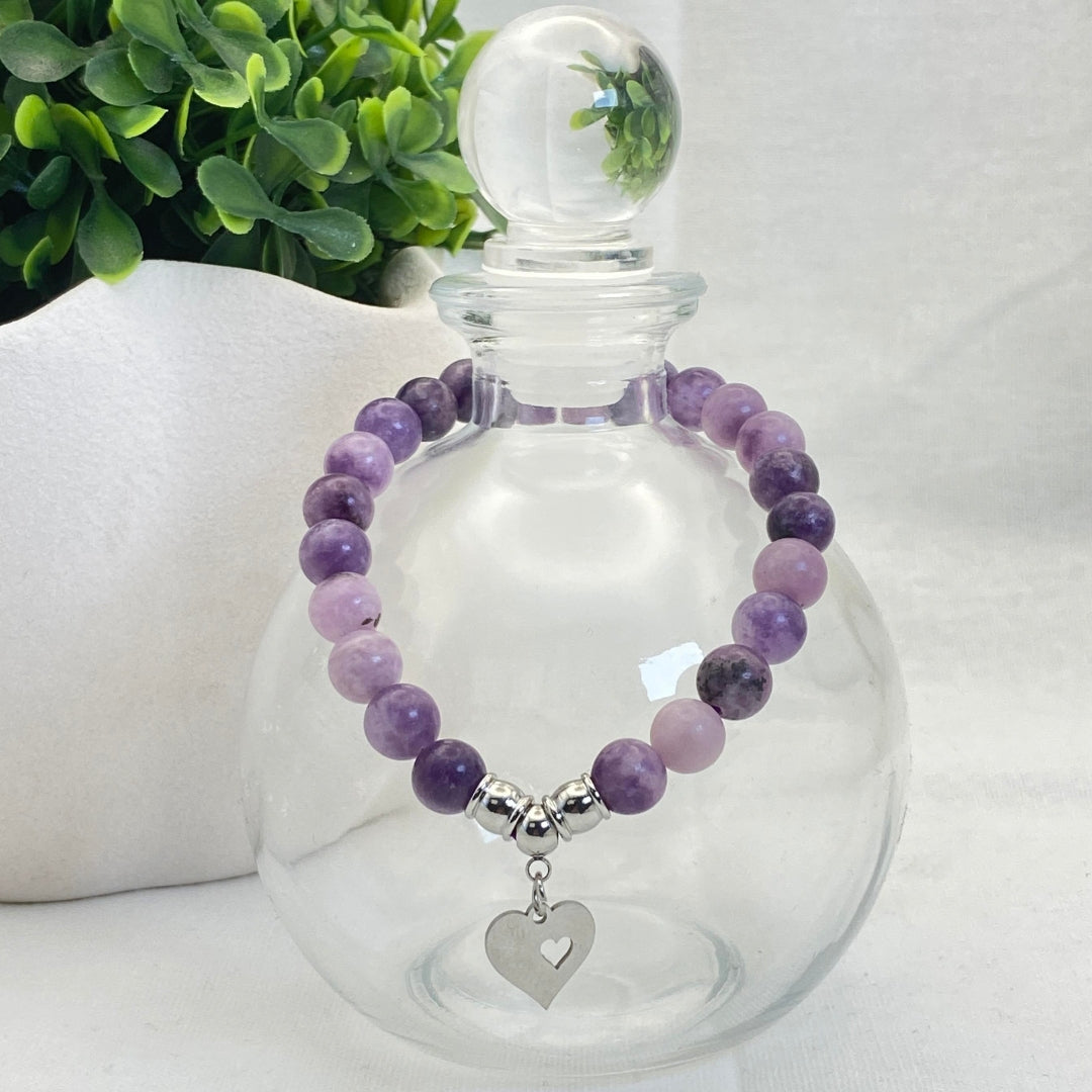 8mm Lepidolite stretch bracelet with stainless steel heart charm. Available in both standard sizing and relaxed-fit. Comes with a velvet pouch for easy gift-giving.
