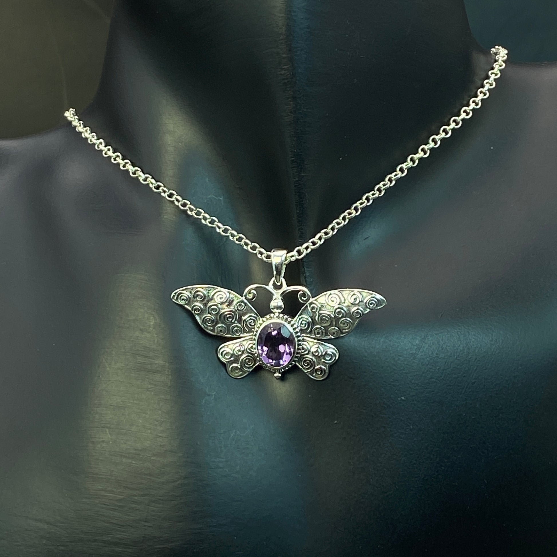 Beautiful sterling silver filigree butterfly pendant with a faceted oval Amethyst gem. Comes in an elegant suede pouch for easy gift-giving.