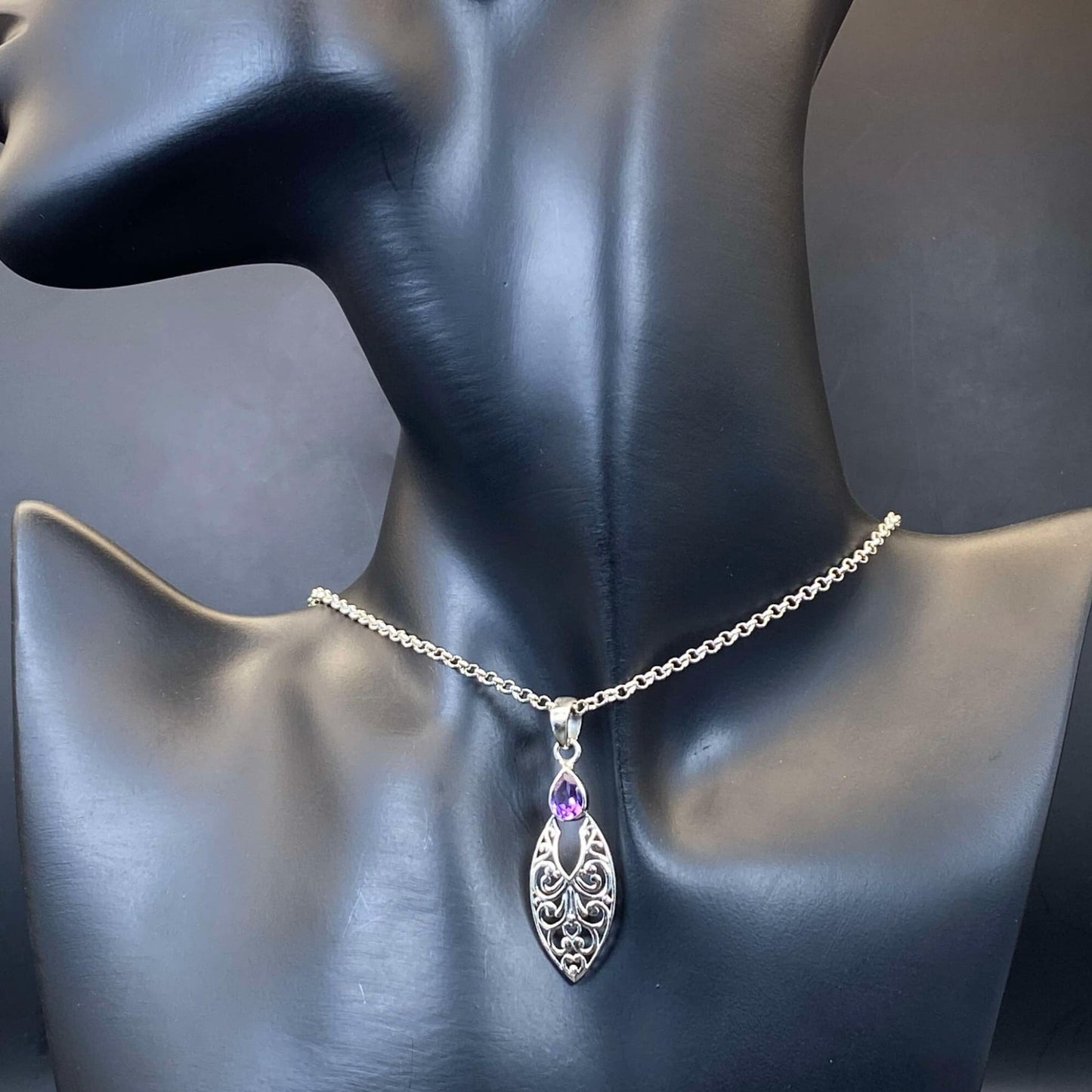 Sterling silver filigree teardrop pendant with a stunning faceted Amethyst gem. Comes in a beautiful gift pouch for easy gift-giving.