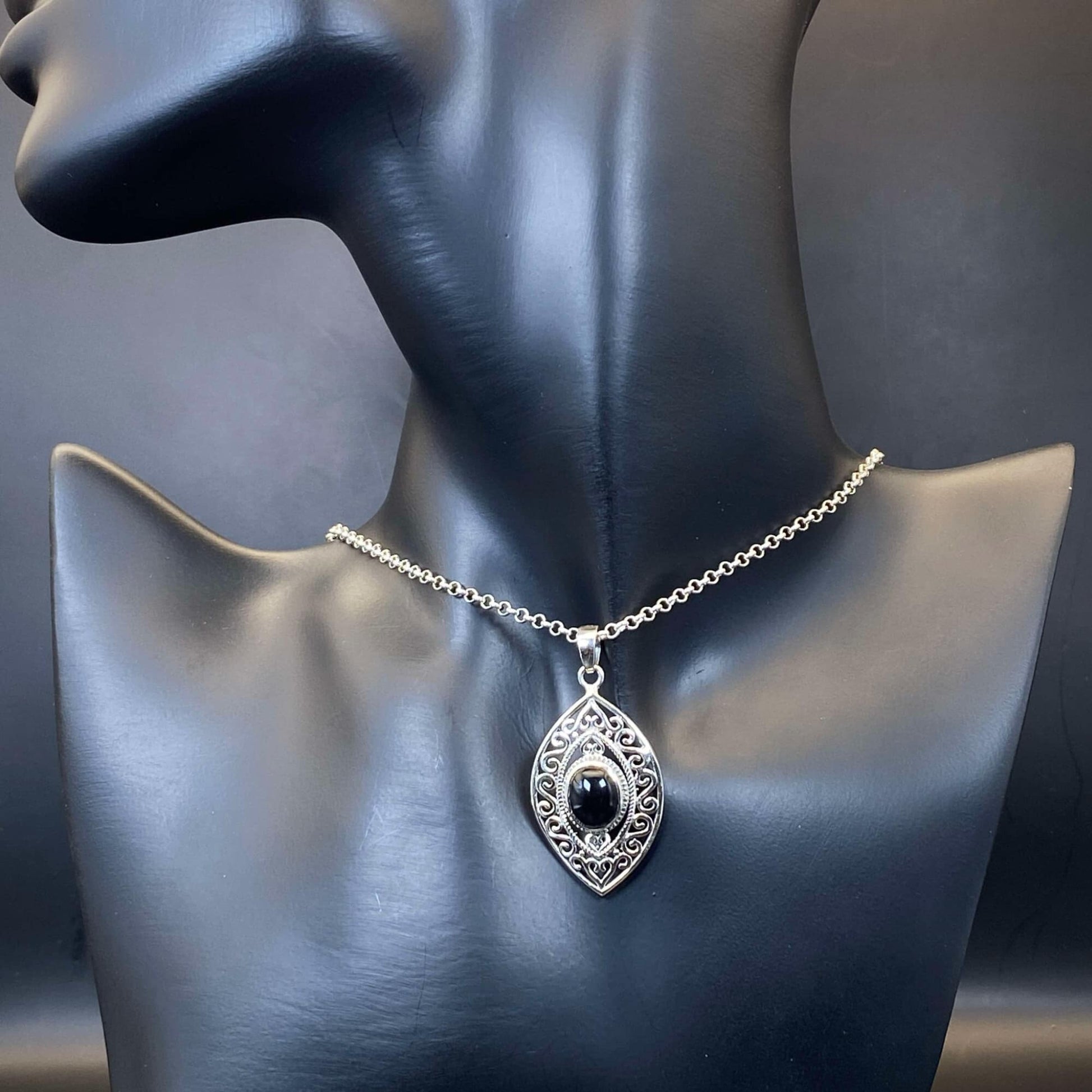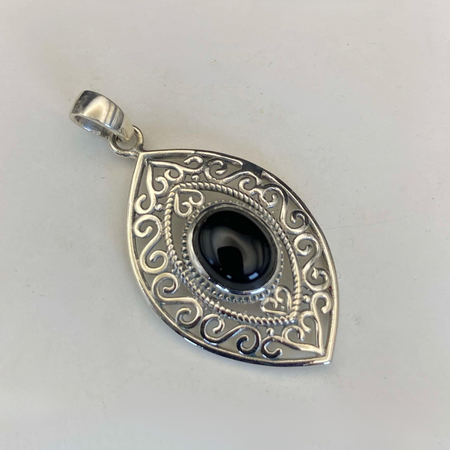 Sterling silver filigree marquis pendant with a beautiful oval Black Onyx gem. Comes in a beautiful gift pouch for easy gift-giving.