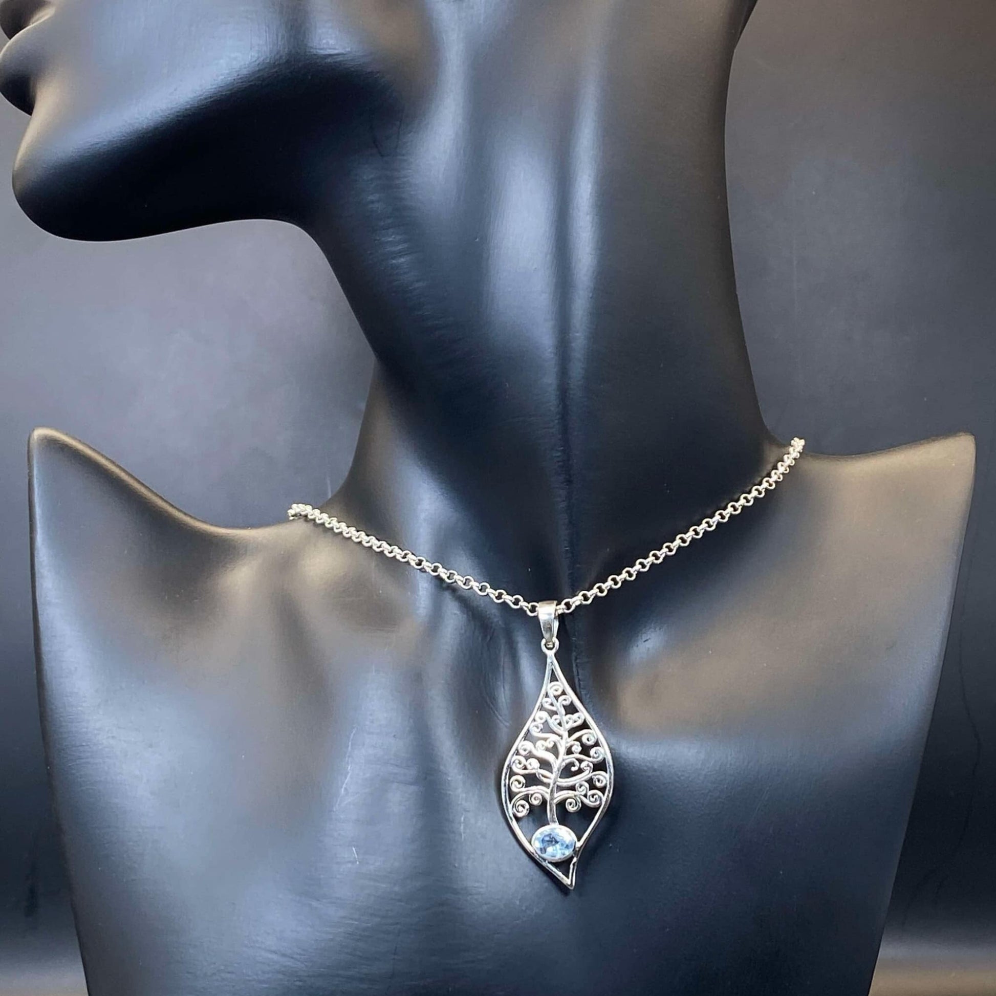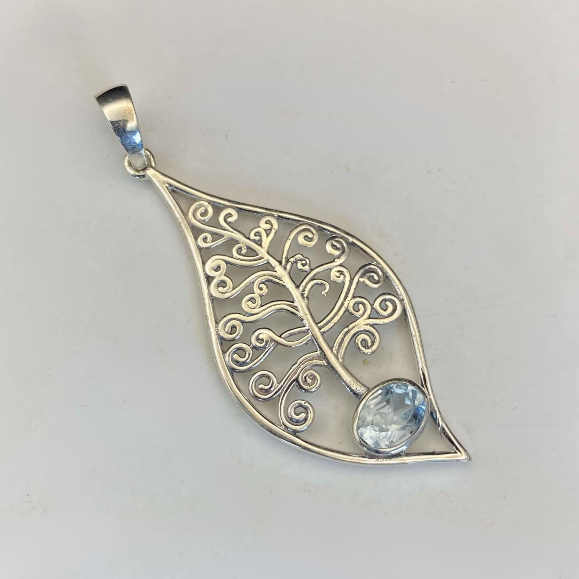 Sterling silver filigree Tree of Life pendant with a faceted oval Blue Topaz gems. Comes in a beautiful gift pouch for easy gift-giving.