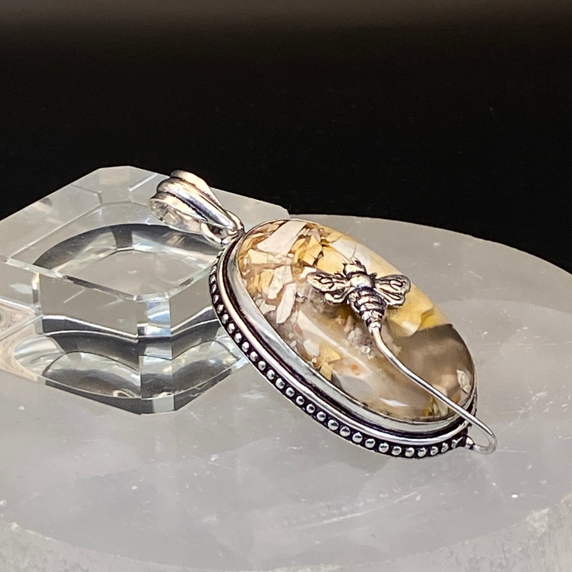 .925 Sterling Silver Brecciated Mookaite Jasper with Quartz Oval Bee Pendant