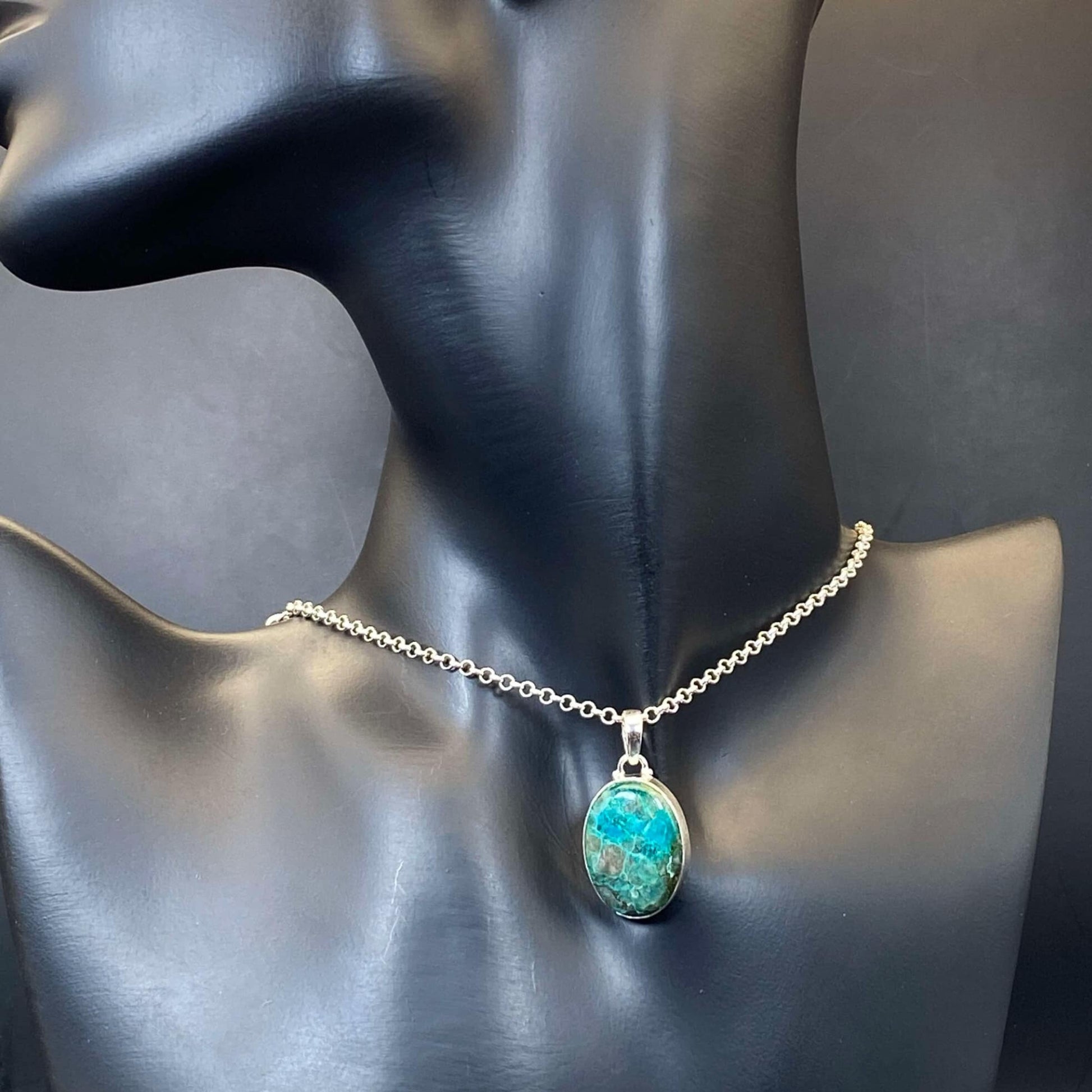 Sterling silver pendant with a beautiful oval Chrysocolla gem. Comes in a beautiful gift pouch for easy gift-giving.