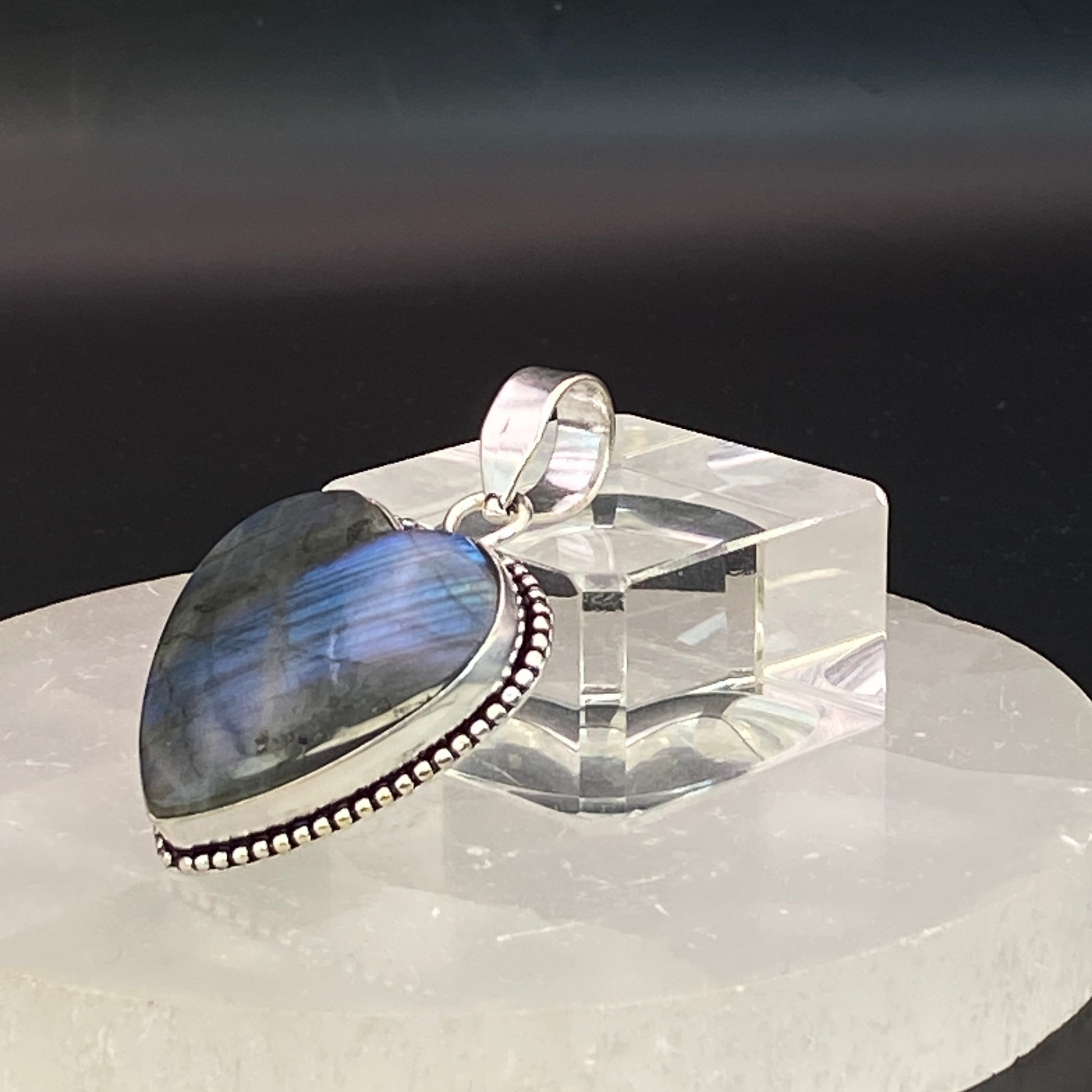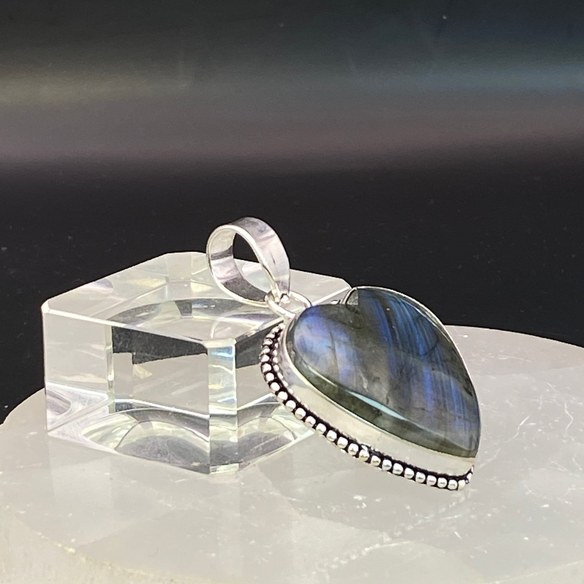 Labradorite is considered a tremendously spiritual stone, especially helpful for people who tend to overwork. It helps you regain energy while aiding the body and spirit in healing itself. It's considered one of the most powerful protectors, creating a shield for auras and protecting against negativity. It's known as a stone of transformation, enhancing strength of will and inner worth. Said to stimulate the Throat chakra, and is an excellent stone for awakening one's own awareness of inner spirit, intuition and psychic abilities.