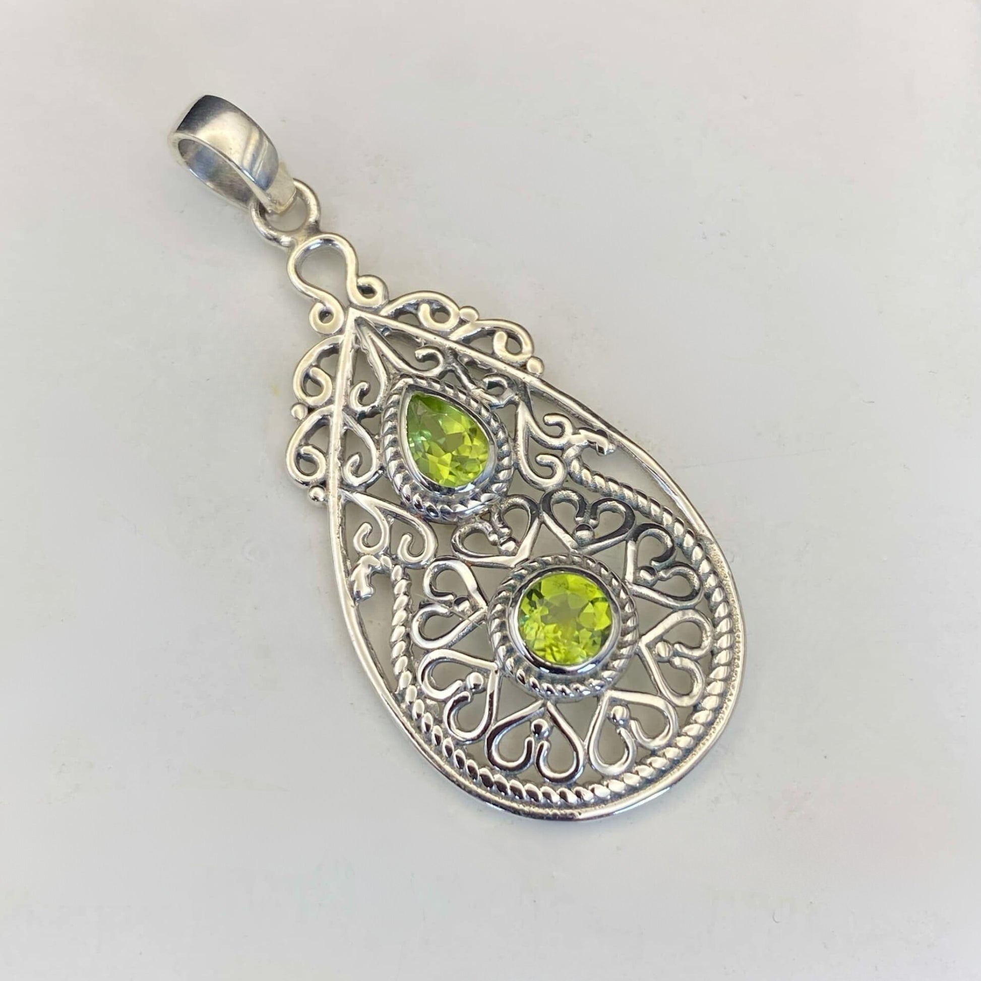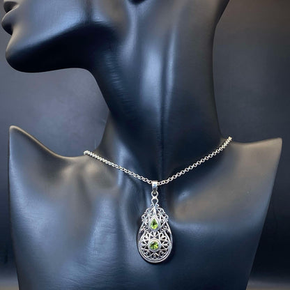 Sterling silver filigree teardrop pendant with two stunning faceted Peridot gems. Comes in a beautiful gift pouch for easy gift-giving.