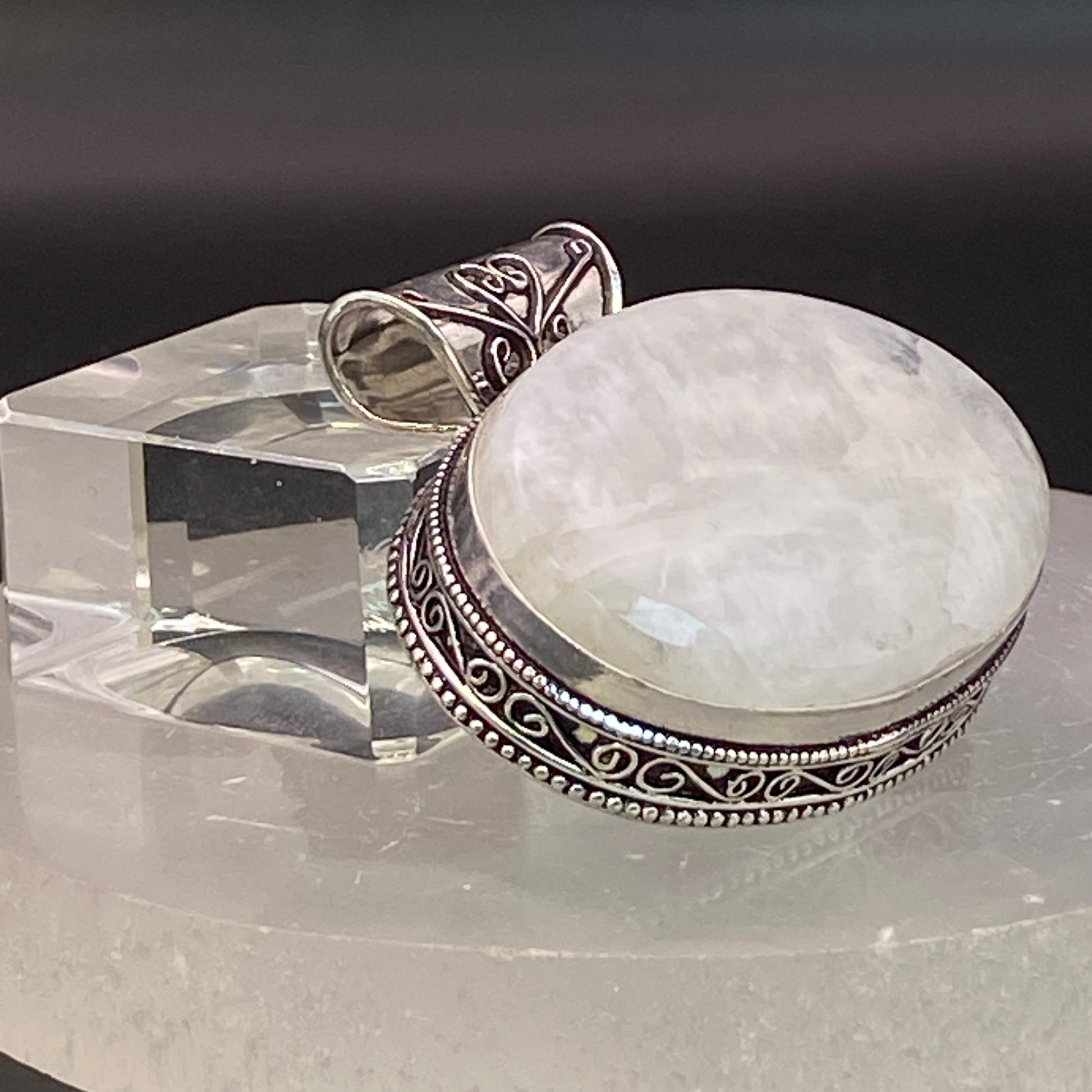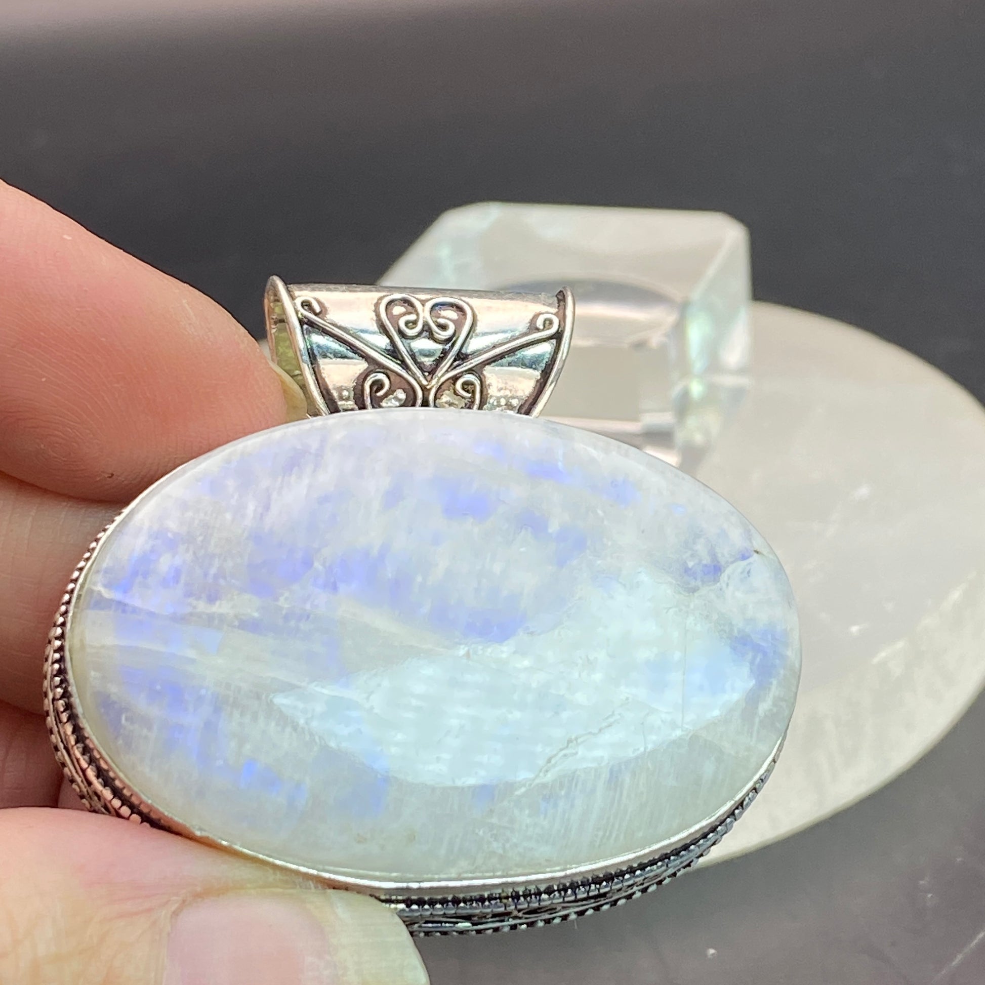 Stunning Rainbow Moonstone sterling silver pendant with blue flash across the entire face. Comes in a beautiful velvet pouch for easy gift-giving.