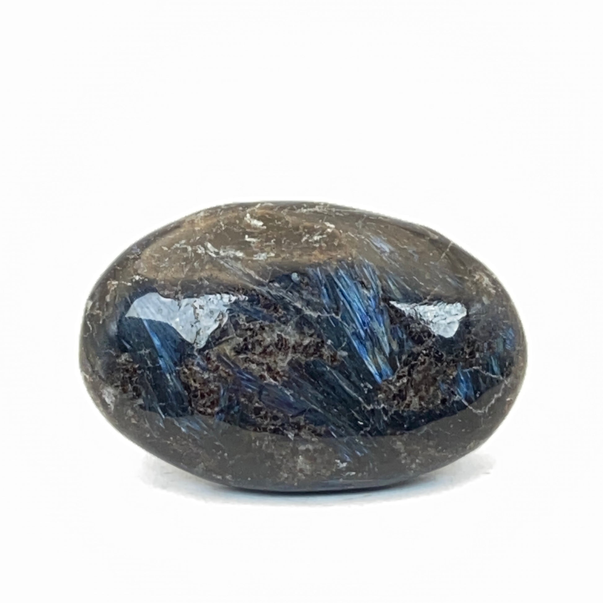 Arfvedsonite is often mistaken, or confused, with Astrophyllite, as they both have incredible inclusions of star-like sparkles (or 'fireworks'), but they are completely different minerals with different chemical makeups. Arfvedsonite is a sodium amphibole mineral and always has a blue shimmer, while Astrophyllite is a hydrous potassium iron titanium silicate and always has a copper, reddish-brown or bronze shimmer.