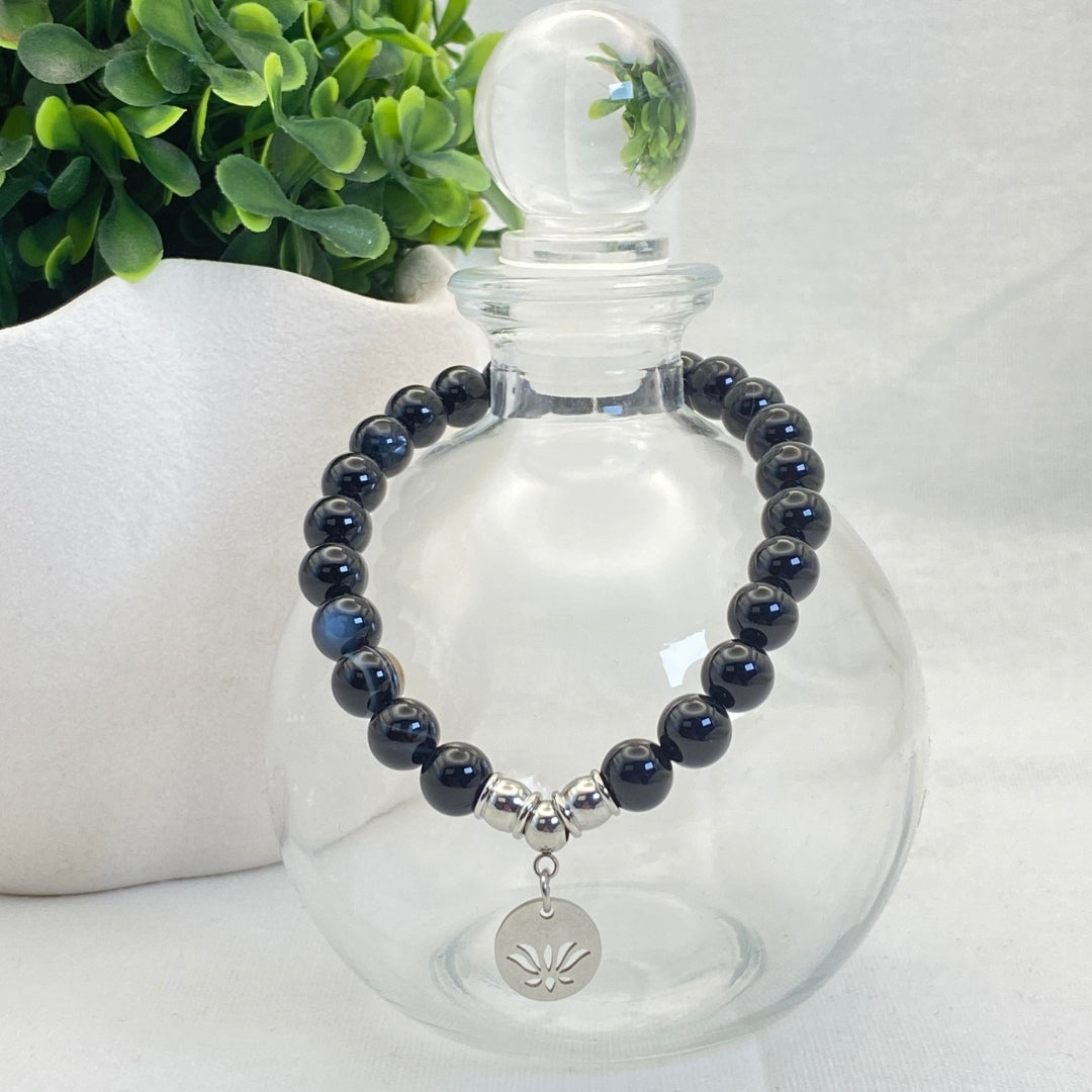 8mm Black Onyx stretch bracelet with stainless steel lotus charm. Available in both standard size and relaxed-fit! Comes with a velvet pouch for easy gift-giving.