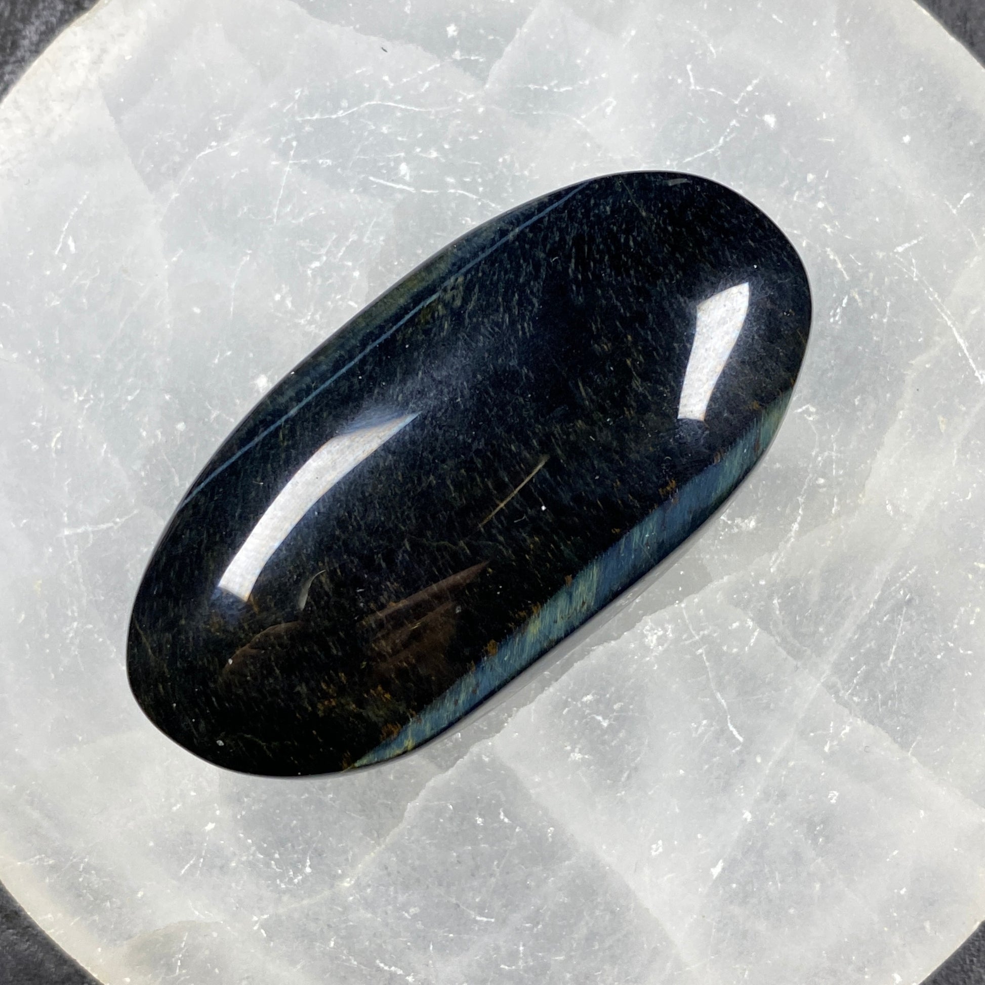 Blue Tiger's Eye, also known a s 'Hawk's Eye' or 'Falcon Eye', is a stunning gem that's been used for thousands of years in jewellery, talismans, and other decorative objects. The ancient Egyptians believed it had powerful properties, using it as amulets for protection against evil spirits, and the ancient Romans and Greeks highly-valued the stone. The blue colour comes from the natural Crocodolite fibres within the stone that have yet to fully crystalise into Limonite. With its soothing energy, it is said to help bring emotional balance and comfort in the event of loss. It is an intuitive stone, helping you channel your energies toward higher vibrations, increase focus, and open your Third Eye. A good manifestation tool.