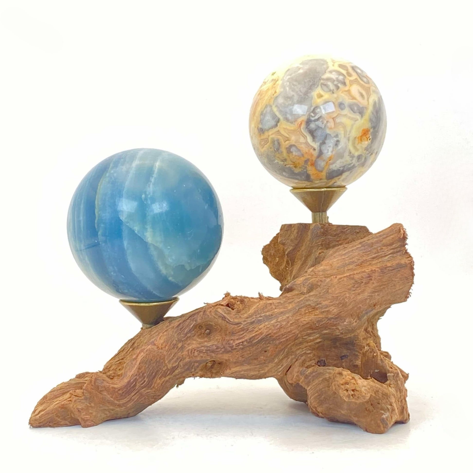 One-of-a-kind natural wood sphere stand. Holds 2 spheres.