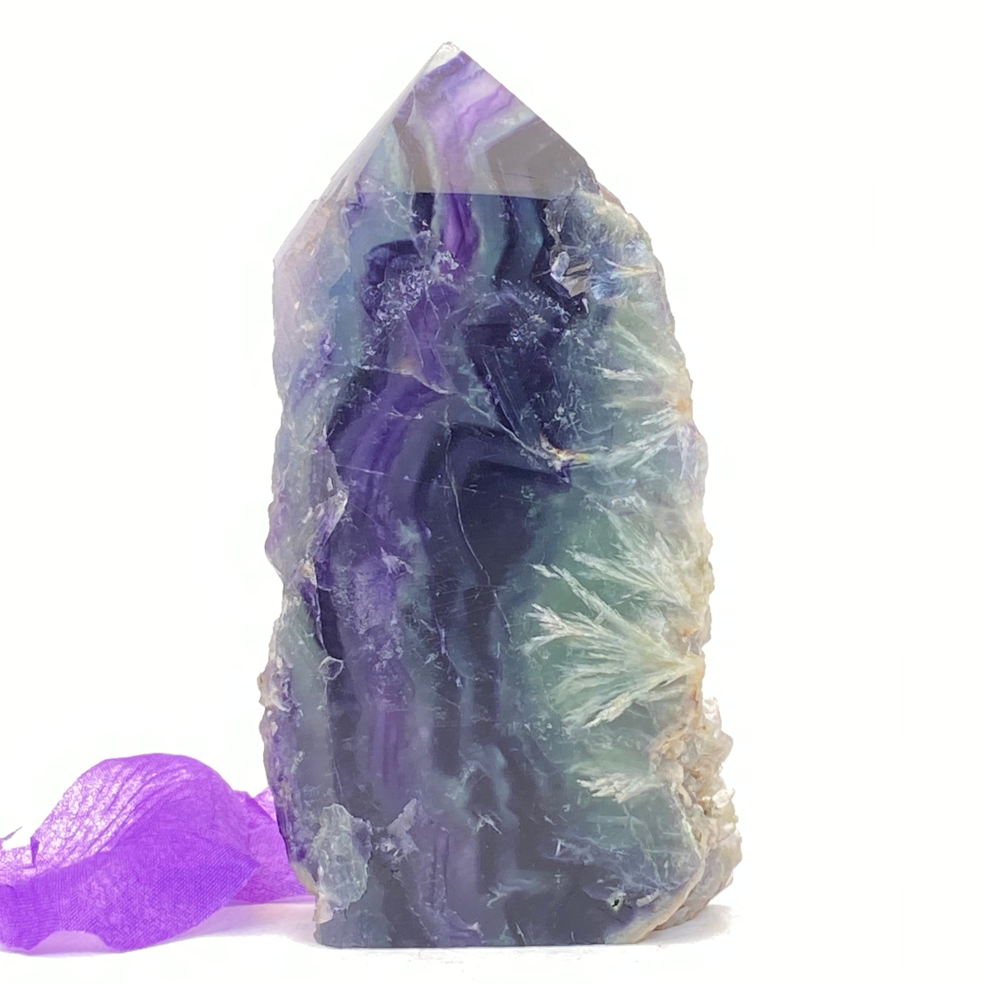 Feather Fluorite (also know as Snowflake or Angel Wing Fluorite) is distinguished by its ethereal feather-like inclusion of Baryte (and Quartz in some instances). For many years, the white inclusions were believed to be Scolecite, but after being subjected to extensive scientific testing in 2022, it was proven to be Baryte.