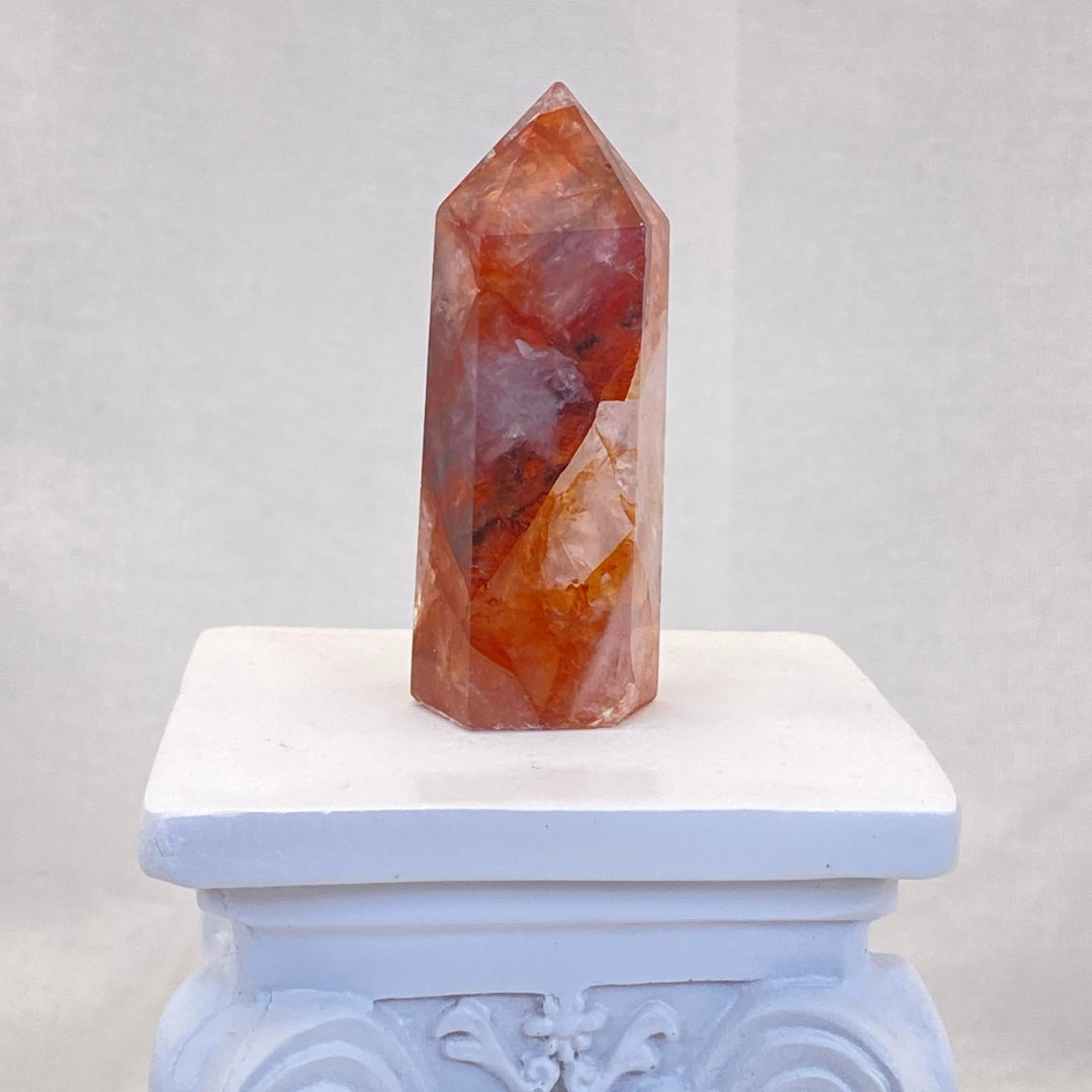 Fire Quartz is also known as Hematoid Quartz. The red 'flames' within the Clear Quartz are streaks of Hematite. Quartz is well known for being able to amplify, store, and direct the flow of energy. It helps to raise our personal vibration and dissolve blockages that are creating imbalances. It amplifies intentions and intuitive abilities. Fire Quartz helps fan the flames of our motivation and determination to help us achieve our dreams.