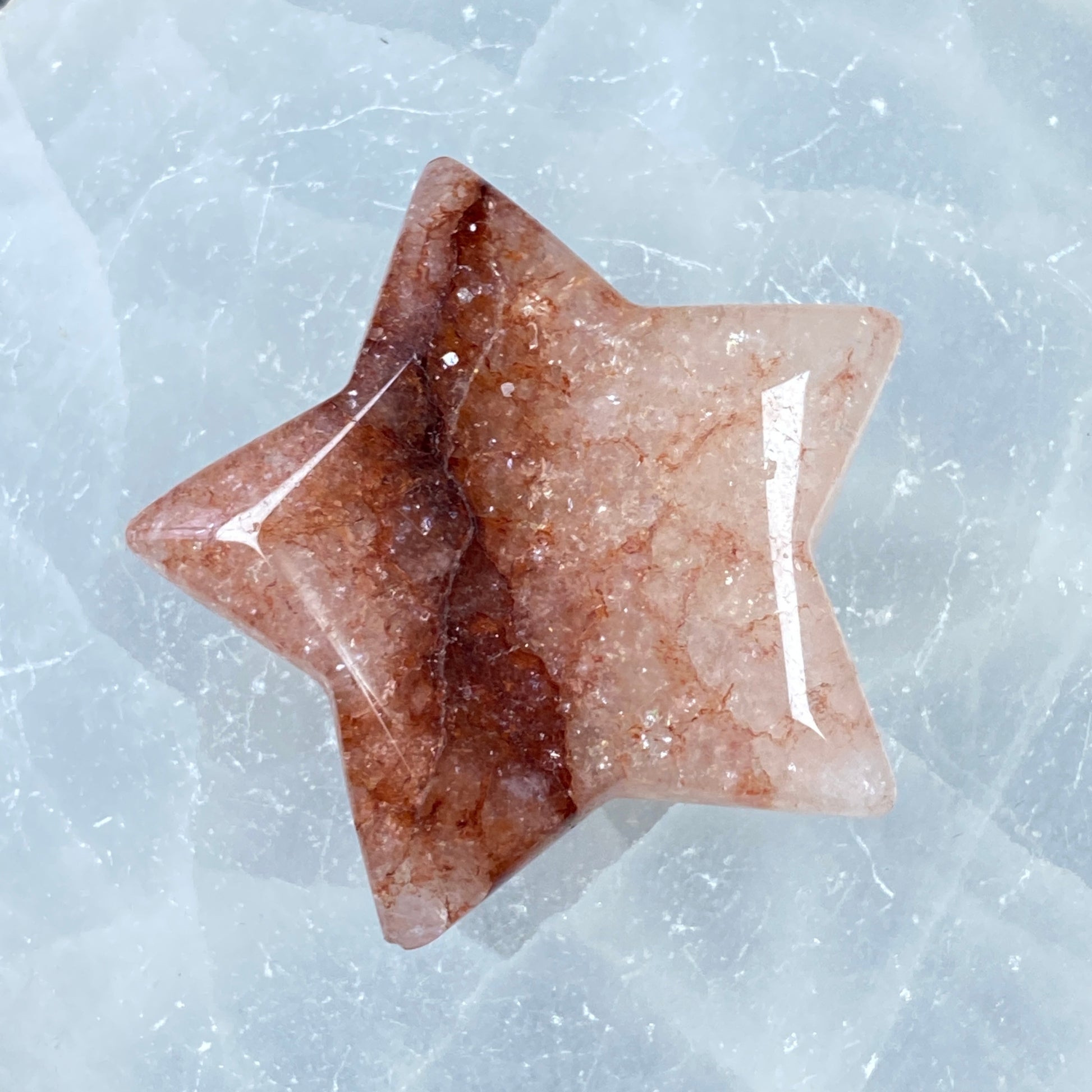 Fire Quartz is also known as Hematoid Quartz. The red 'flames' within the Clear Quartz are streaks of Hematite. Quartz is well known for being able to amplify, store, and direct the flow of energy. It helps to raise our personal vibration and dissolve blockages that are creating imbalances. It amplifies intentions and intuitive abilities. Fire Quartz helps fan the flames of our motivation and determination to help us achieve our dreams.