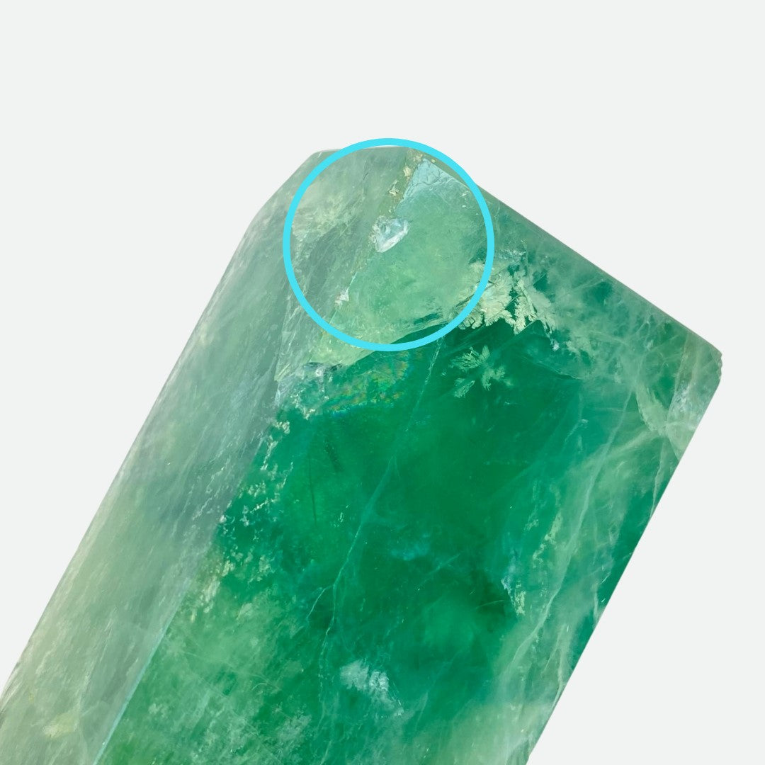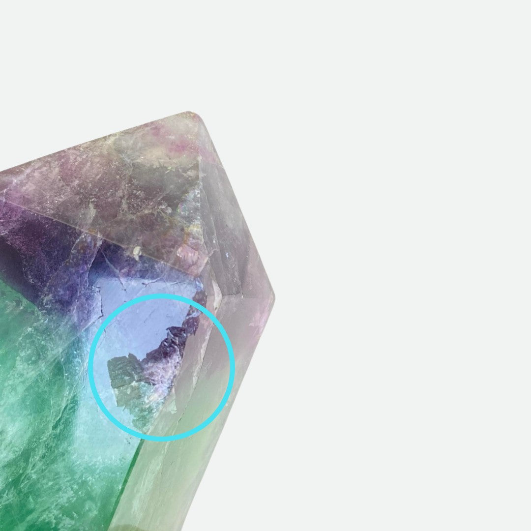 This decent-sized Fluorite tower has been through the wars a little. He's got a few small chips near the base and some larger ones near the top (see pics). Has also had a slight snip on the tip. Far from perfect, but beautiful, nonetheless.
