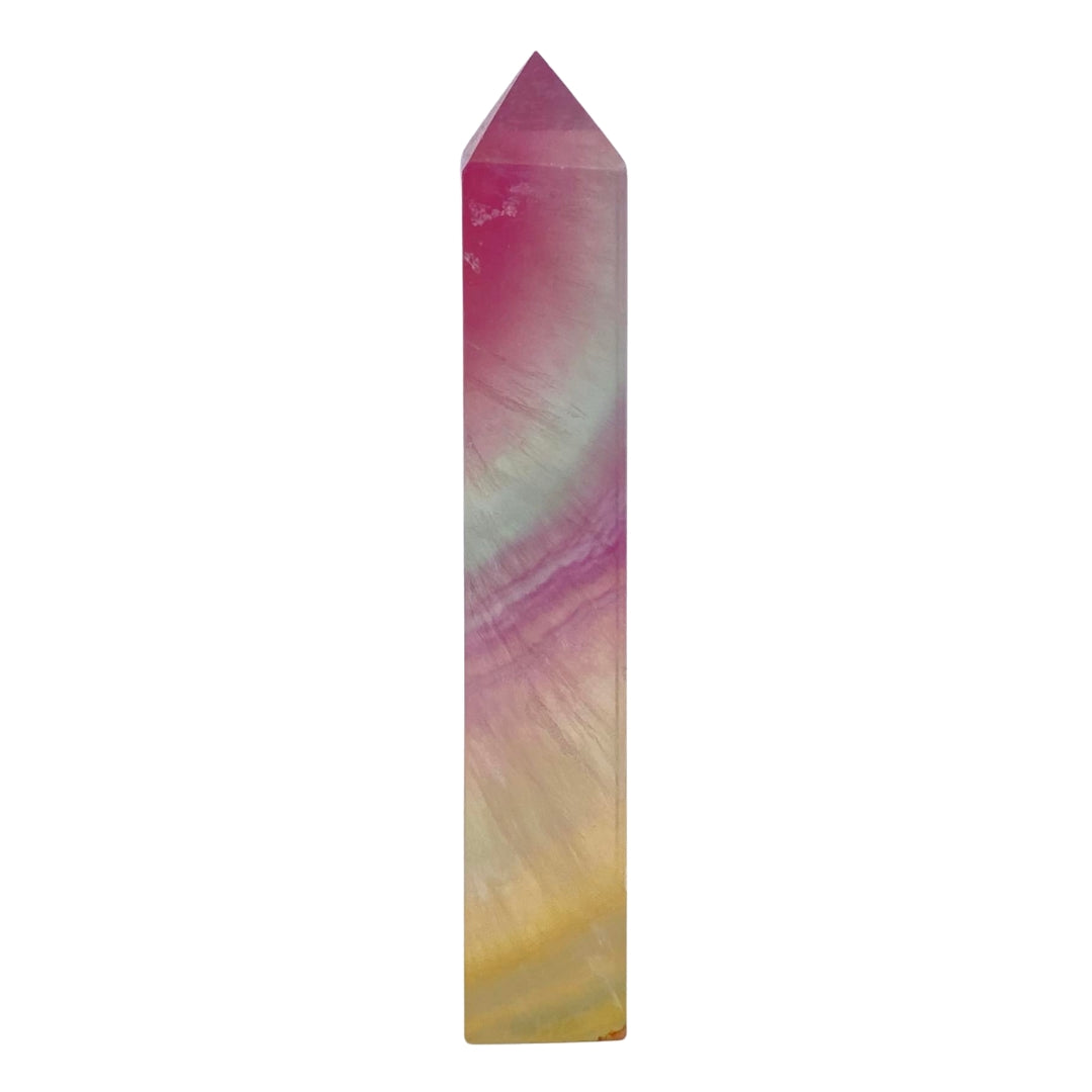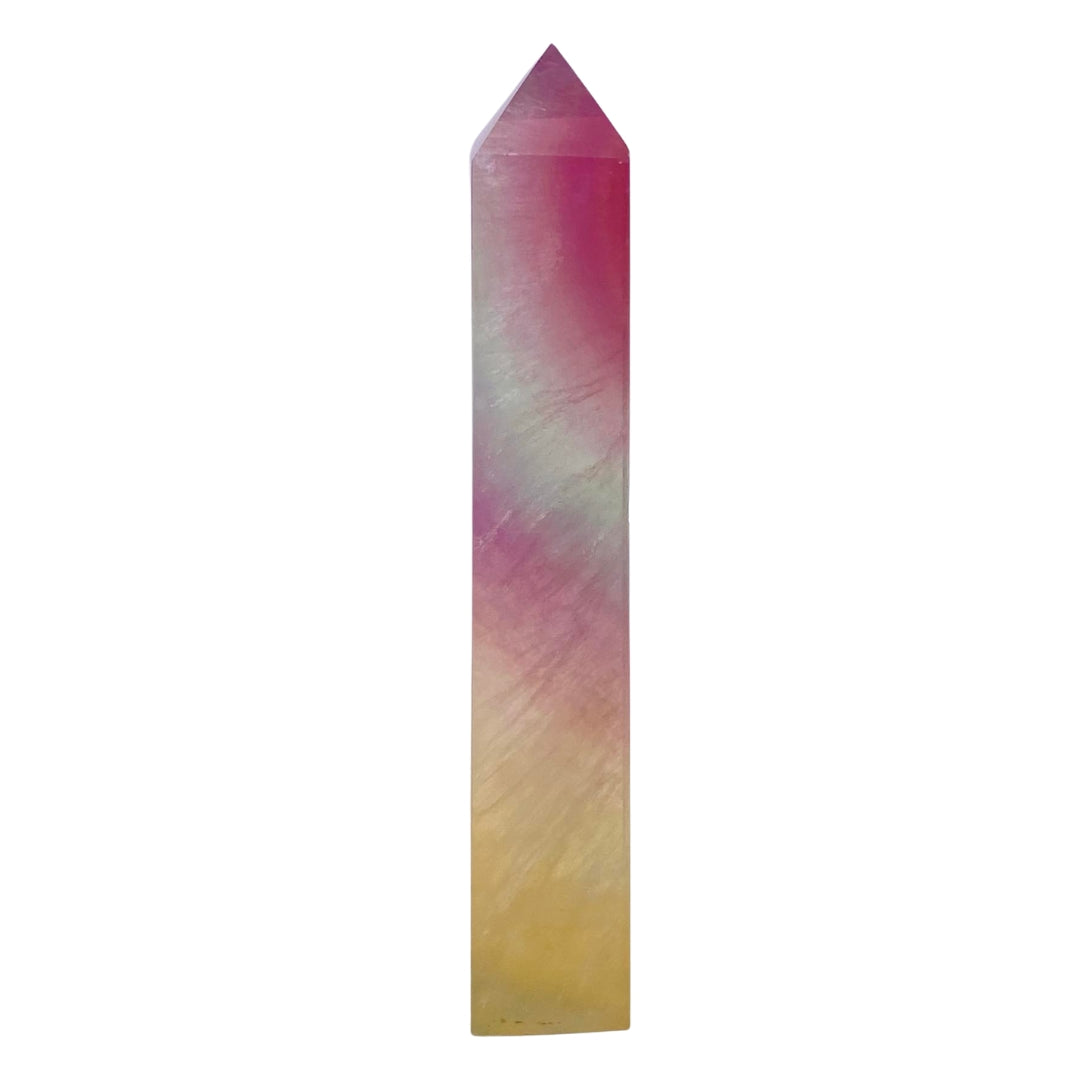 This Watermelon Fluorite tower has a beautiful, soft array of purple, green and yellow. Absolutely stunning, except for a few tiny chips (see pic...only the bigger chip would show on film, not the two teeny tiny ones).