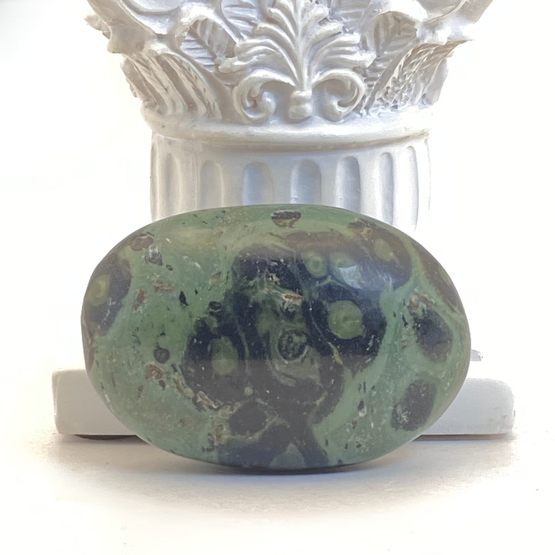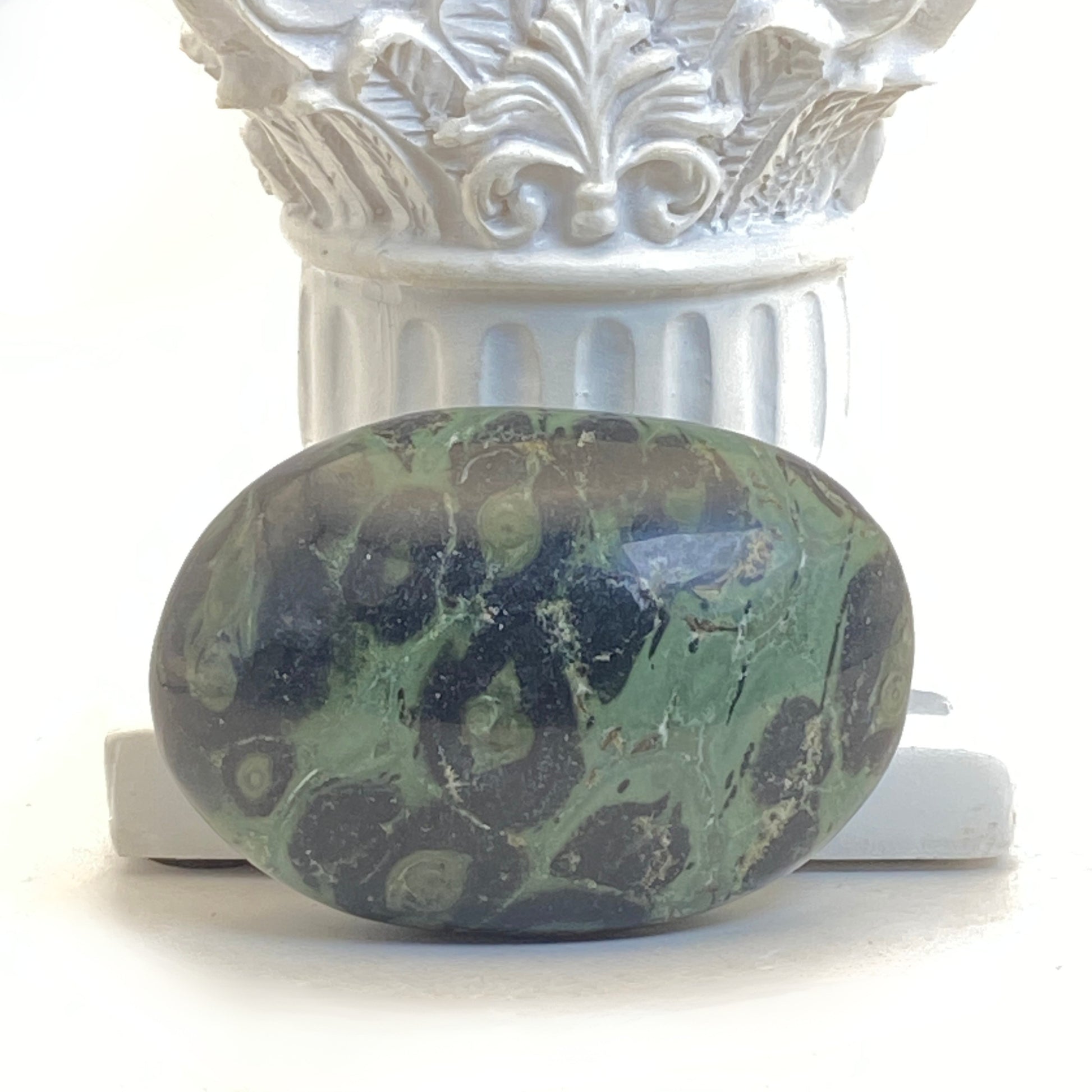 Kambaba Jasper, also known as Crocodile Rock or Green Stromatolite Jasper, is an extremely old stone dating back to 3 billion years ago. It is classified as a stromatolite, which refers to the clump of fossilised algae that created this mineral. Kambaba is a stone of peace and tranquillity, imbued with the nourishing green energy of nature. Its dark mystic circles and deep green swirls comforts and protects, calms and relaxes, soothing troubled minds and restoring balance to the body and spirit. Its slow steady frequency expands one's ability to focus and is a remarkable aid in meditation, granting the release of negative thoughts and feelings, especially one's consciousness on a continual basis. Stimulating the Heart chakra, it draws wisdom from its ancient life energies and encourages one to open the heart to loving the self and others more fully, and increases the ability to receive love in return.