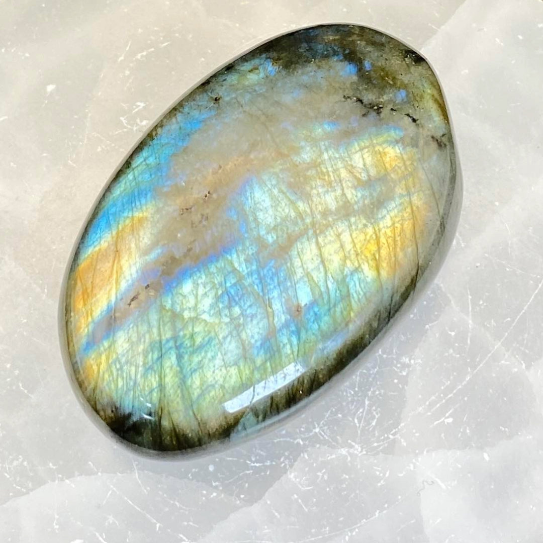 Labradorite is considered a tremendously spiritual stone, especially helpful for people who tend to overwork. It helps you regain energy while aiding the body and spirit in healing itself. It's considered one of the most powerful protectors, creating a shield for auras and protecting against negativity. It's known as a stone of transformation, enhancing strength of will and inner worth. Said to stimulate the Throat chakra, and is an excellent stone for awakening one's own awareness of inner spirit, intuition and psychic abilities.