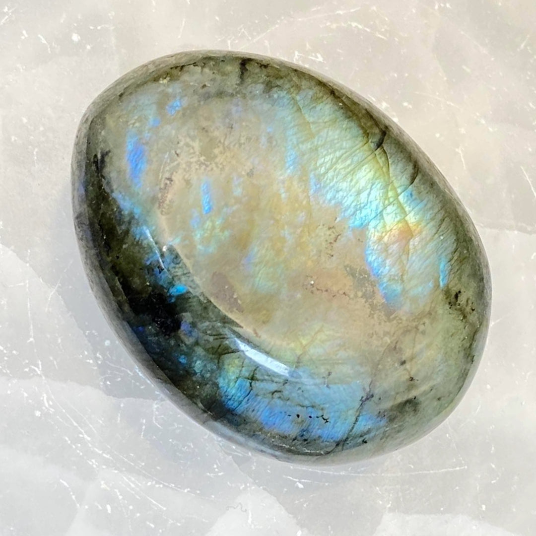 Labradorite is considered a tremendously spiritual stone, especially helpful for people who tend to overwork. It helps you regain energy while aiding the body and spirit in healing itself. It's considered one of the most powerful protectors, creating a shield for auras and protecting against negativity. It's known as a stone of transformation, enhancing strength of will and inner worth. Said to stimulate the Throat chakra, and is an excellent stone for awakening one's own awareness of inner spirit, intuition and psychic abilities.