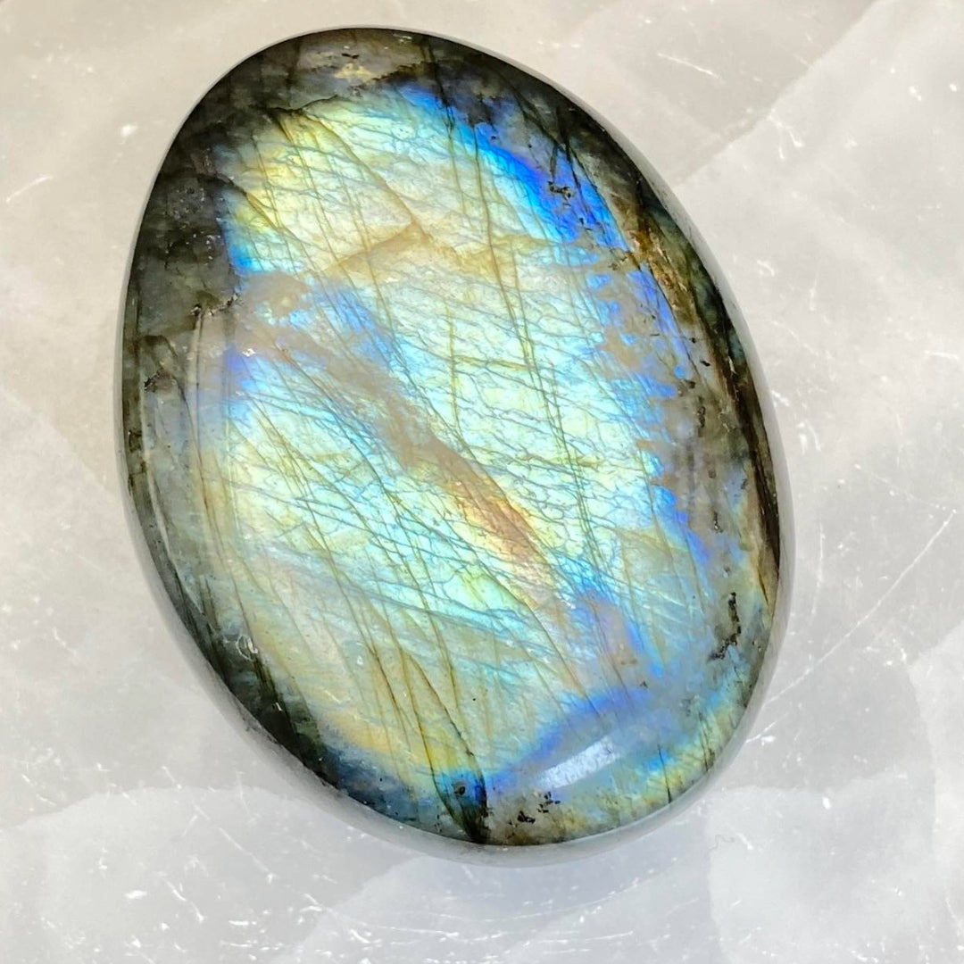 Labradorite is considered a tremendously spiritual stone, especially helpful for people who tend to overwork. It helps you regain energy while aiding the body and spirit in healing itself. It's considered one of the most powerful protectors, creating a shield for auras and protecting against negativity. It's known as a stone of transformation, enhancing strength of will and inner worth. Said to stimulate the Throat chakra, and is an excellent stone for awakening one's own awareness of inner spirit, intuition and psychic abilities.
