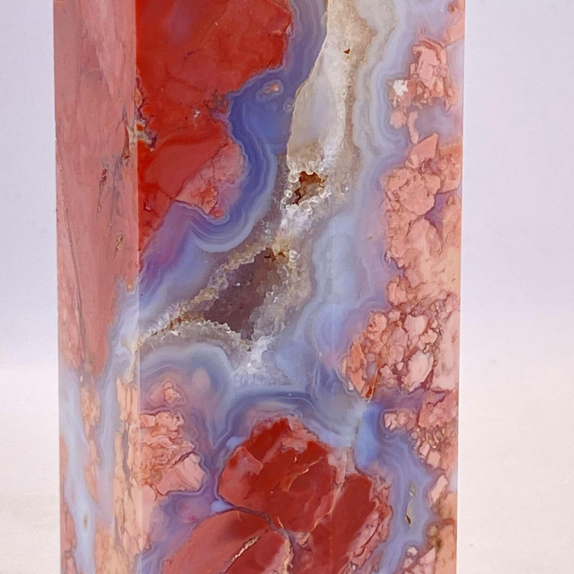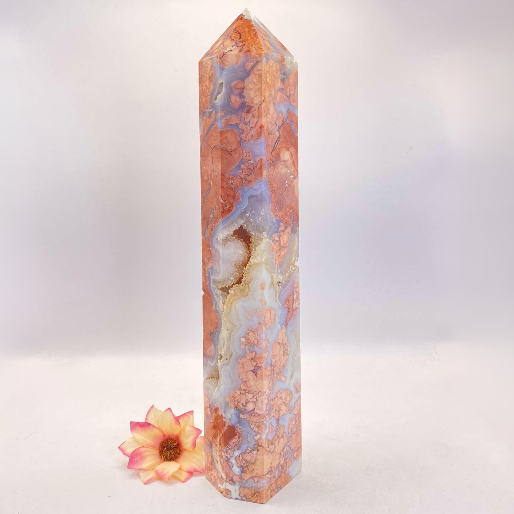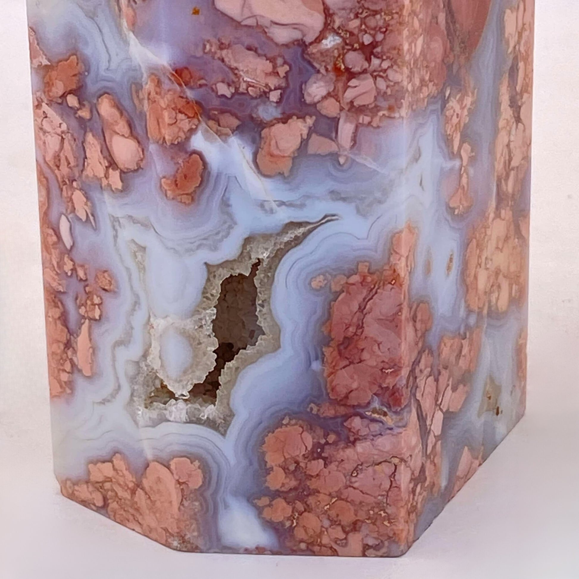 This large tower is beyond beautiful with its many druzy caves and contrasts of varying shades of salmon-pink and almost opal-looking agate. A stunning statement piece for any serious collector.