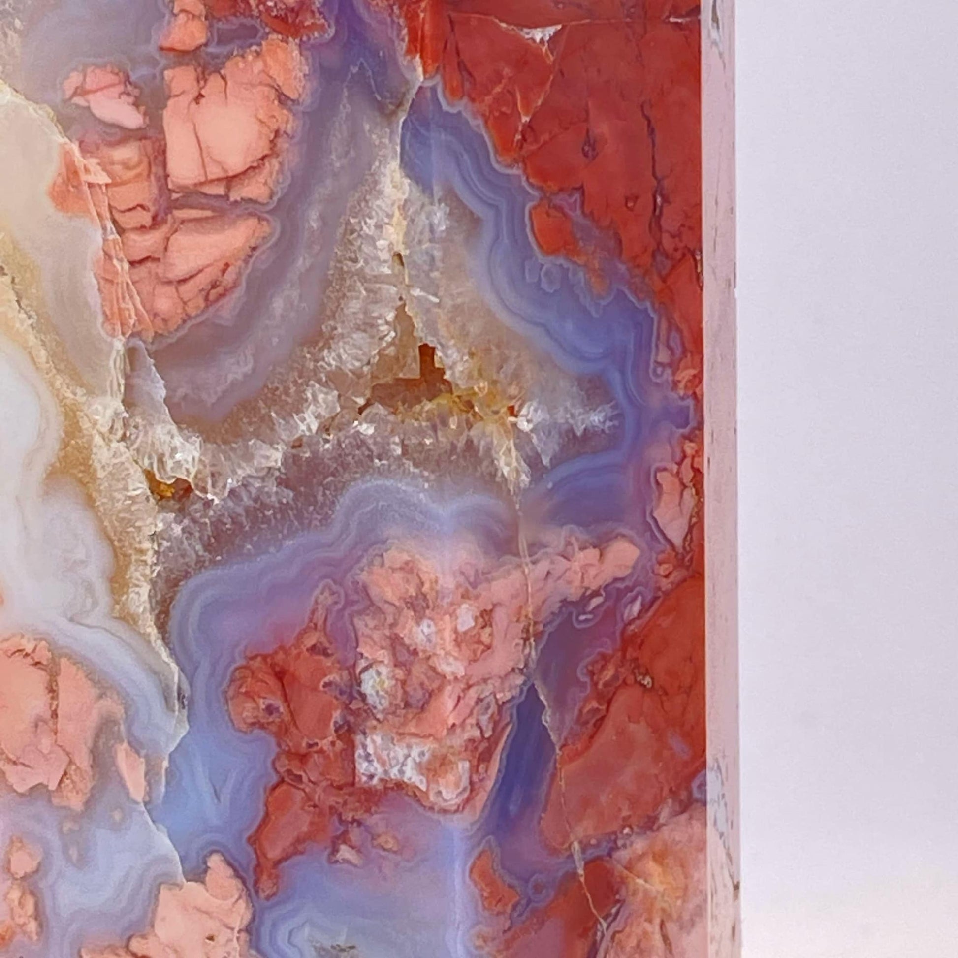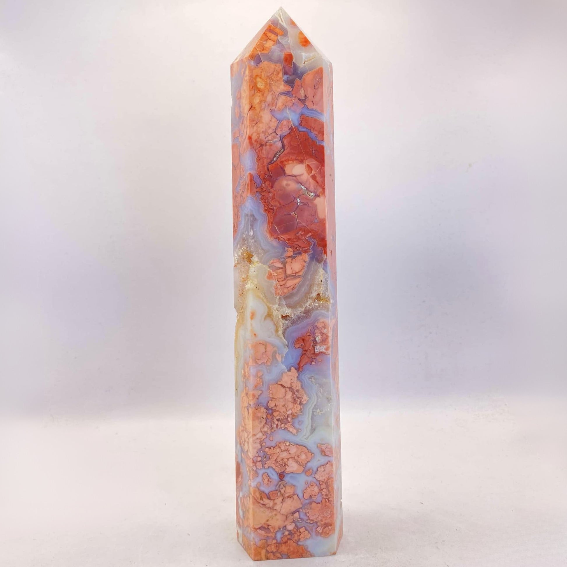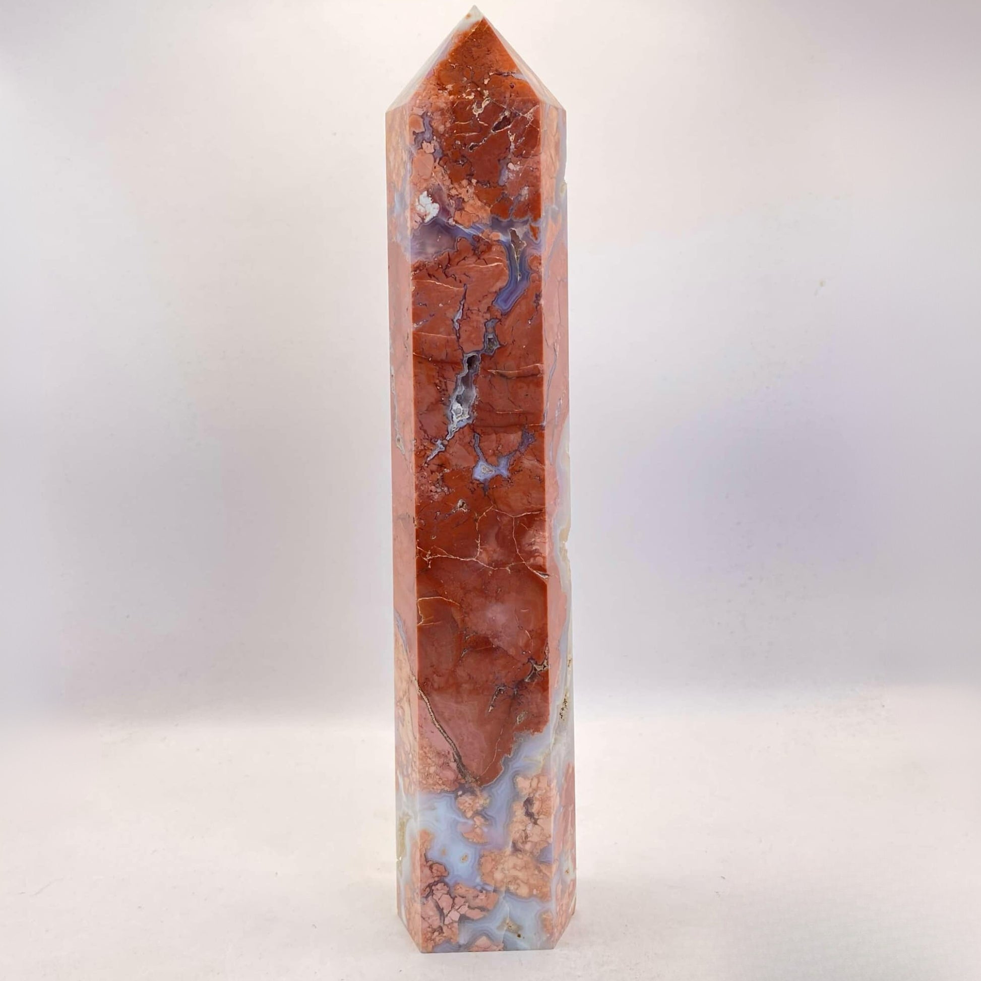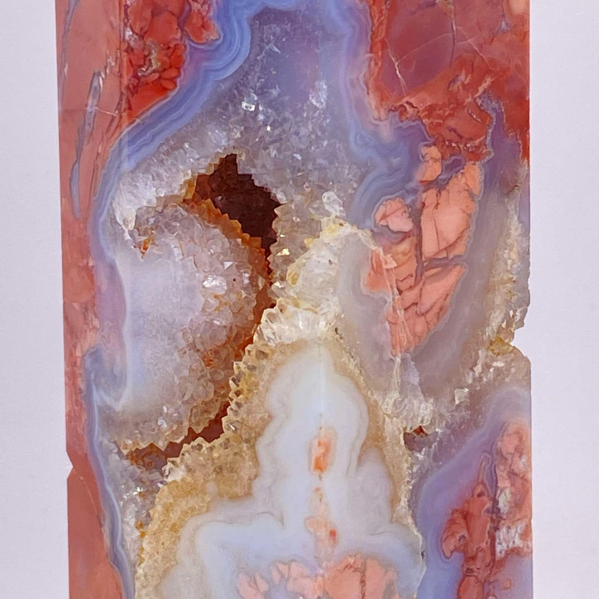 This large tower is beyond beautiful with its many druzy caves and contrasts of varying shades of salmon-pink and almost opal-looking agate. A stunning statement piece for any serious collector.