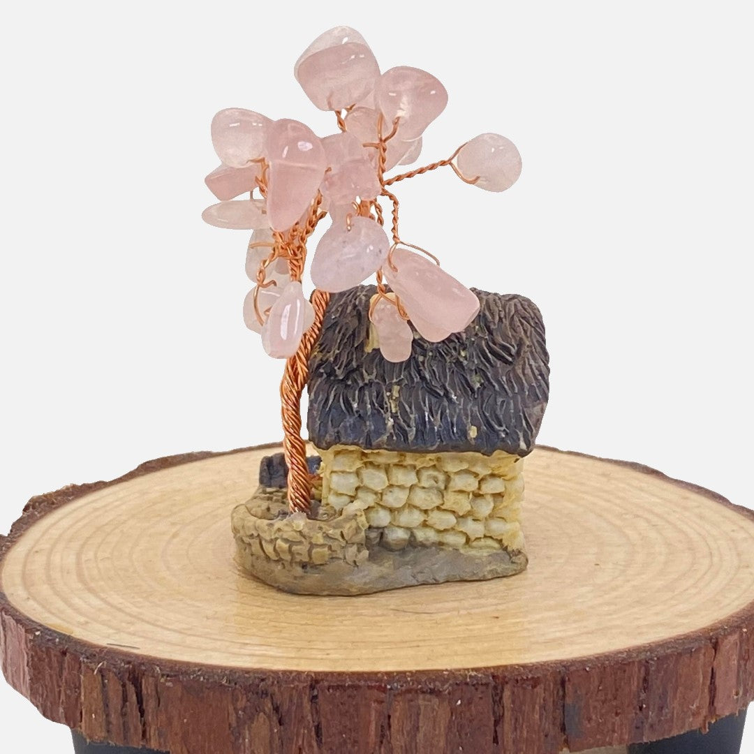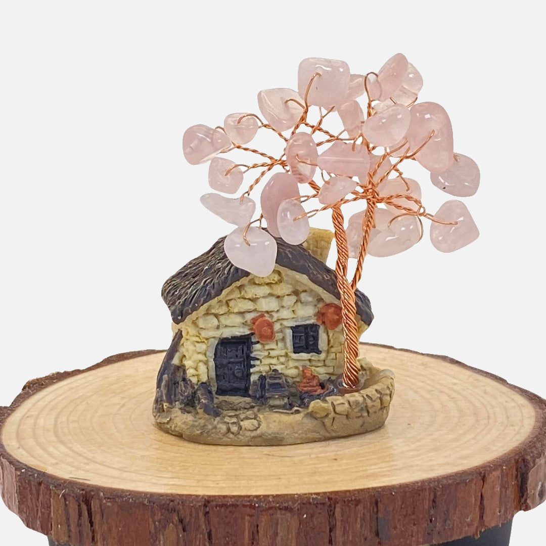 Cute little cottage with a mini Rose Quartz chip tree. Also comes in a range of other stones.