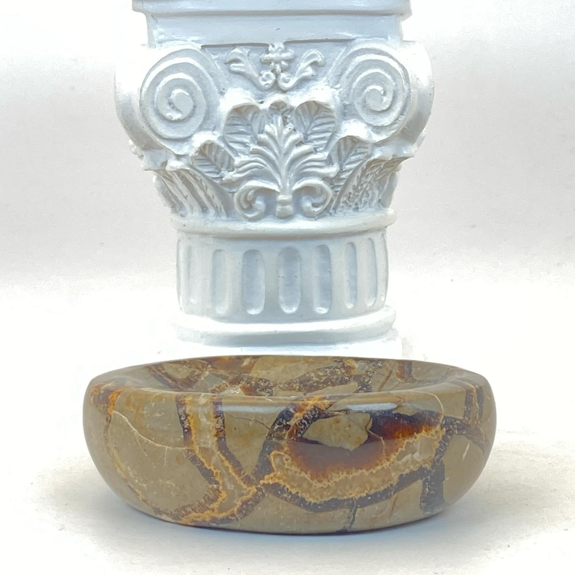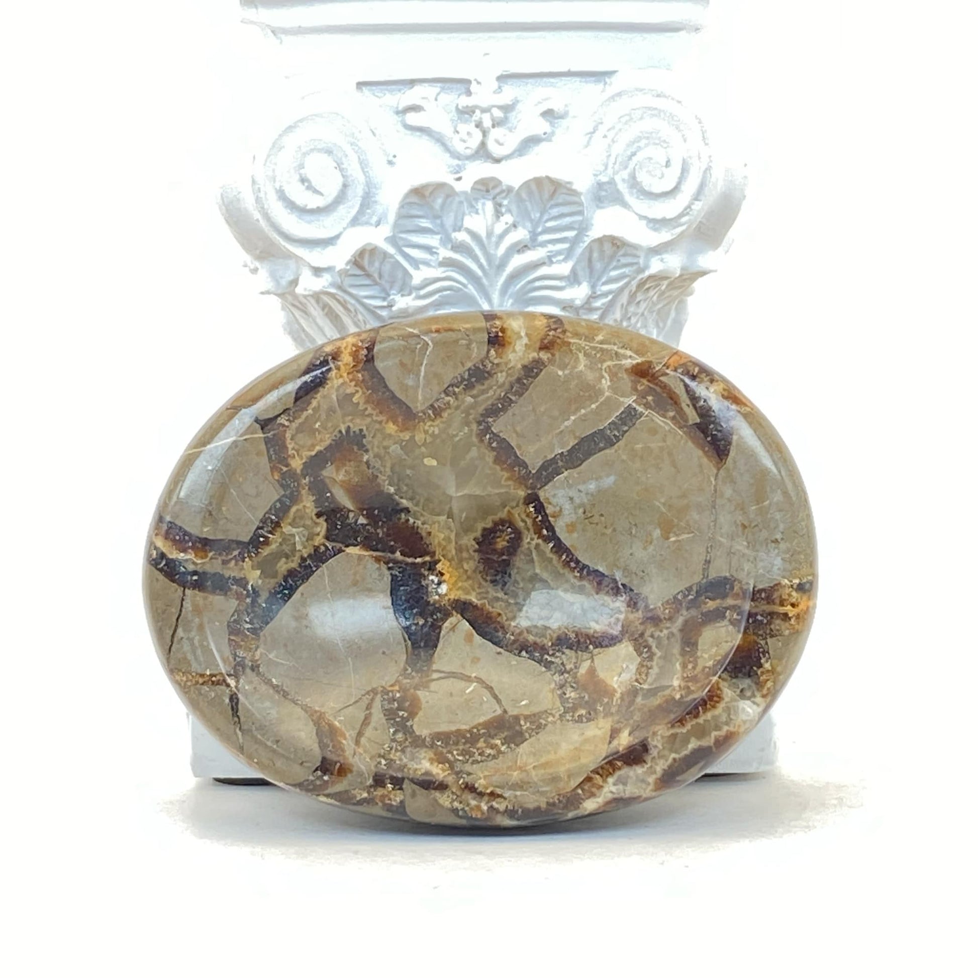 The name Septarian comes from the Latin word 'septem', meaning 'seven', since it seems to form in patterns of seven. The yellow-coloured material is Calcite, the brown is Aragonite, and the outer grey is Limestone. Some specimens may also include white or clear Barite as well. It's often called Septarian Agate or Septarian Jasper, however, it is neither. Both Agate and Jasper are minerals, whereas Septarian is a rock. Formed through volcanic eruptions, its spherical shape and smooth dragon-skin appearance is what earned them the name of Septarian Dragon Eggs. According to Ancient Malagasy (Madagascar native) legend, when dragons ceased to exist millions of years ago, their remains fossilised and formed Septarian. People would use it as a talisman for courage and grounding, believing it drew its powers from deep inside Mother Earth. It is a stone of healing (both physically and metaphysically) and protection.