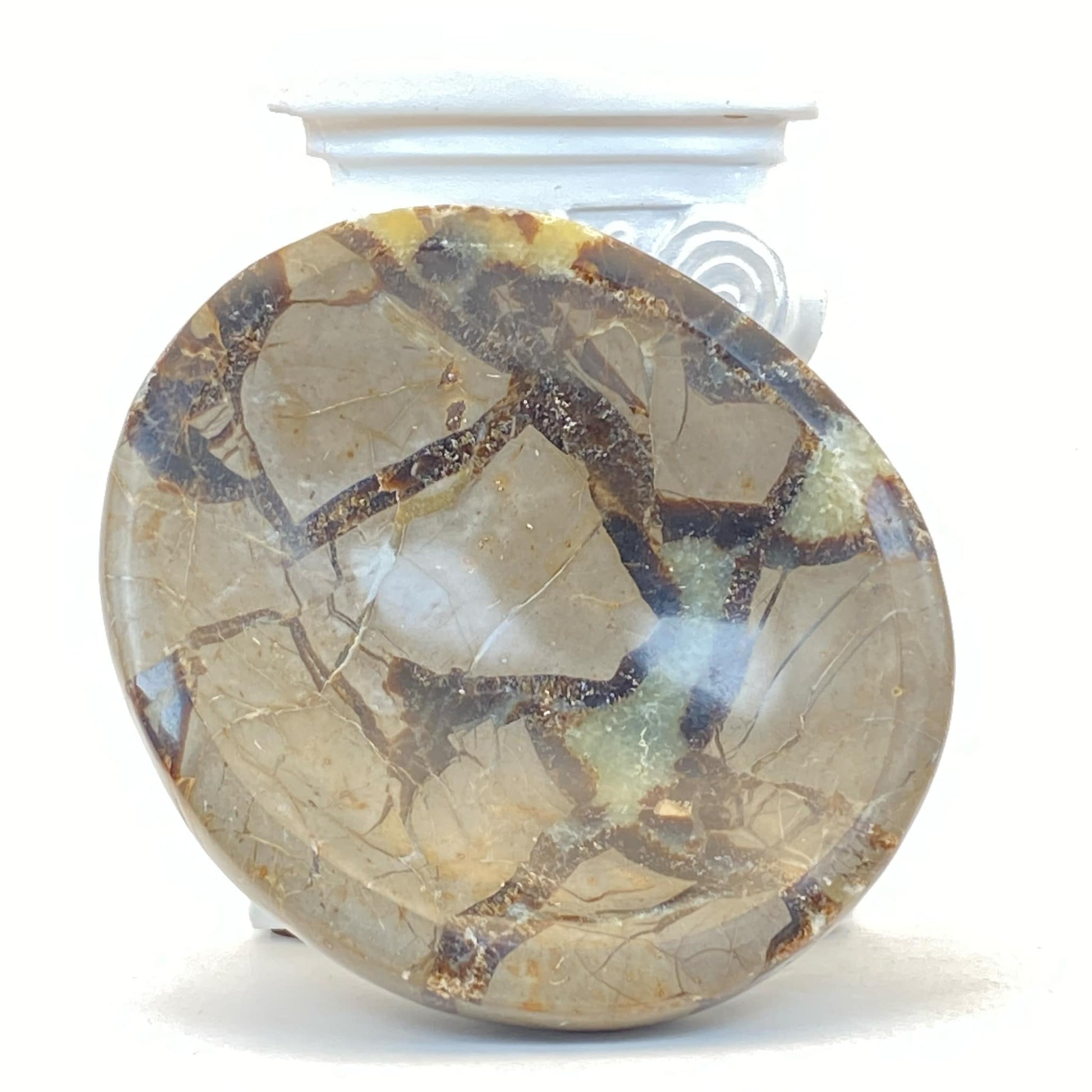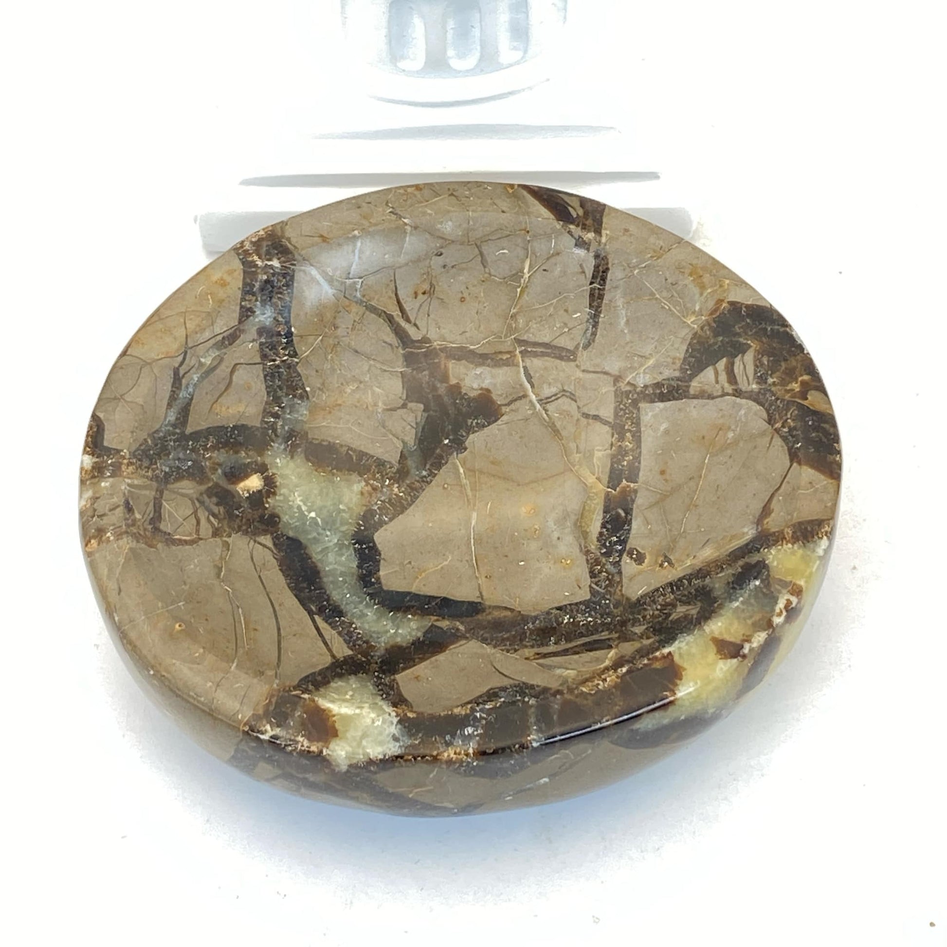 The name Septarian comes from the Latin word 'septem', meaning 'seven', since it seems to form in patterns of seven. The yellow-coloured material is Calcite, the brown is Aragonite, and the outer grey is Limestone. Some specimens may also include white or clear Barite as well. It's often called Septarian Agate or Septarian Jasper, however, it is neither. Both Agate and Jasper are minerals, whereas Septarian is a rock. Formed through volcanic eruptions, its spherical shape and smooth dragon-skin appearance is what earned them the name of Septarian Dragon Eggs. According to Ancient Malagasy (Madagascar native) legend, when dragons ceased to exist millions of years ago, their remains fossilised and formed Septarian. People would use it as a talisman for courage and grounding, believing it drew its powers from deep inside Mother Earth. It is a stone of healing (both physically and metaphysically) and protection.