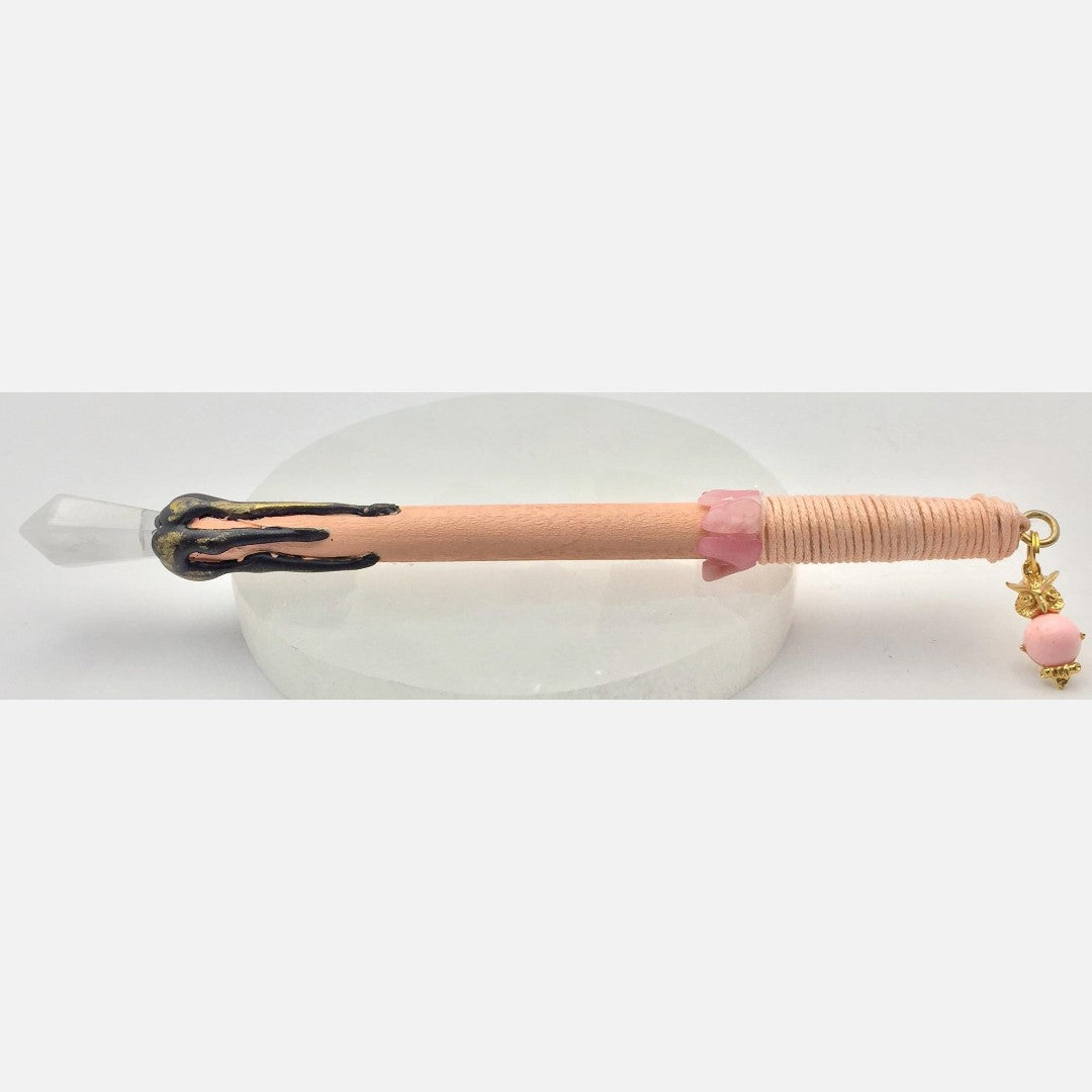 White Rose Quartz polished point with a cute little pink and gold owl charm. Every wand is one-of-a-kind.
